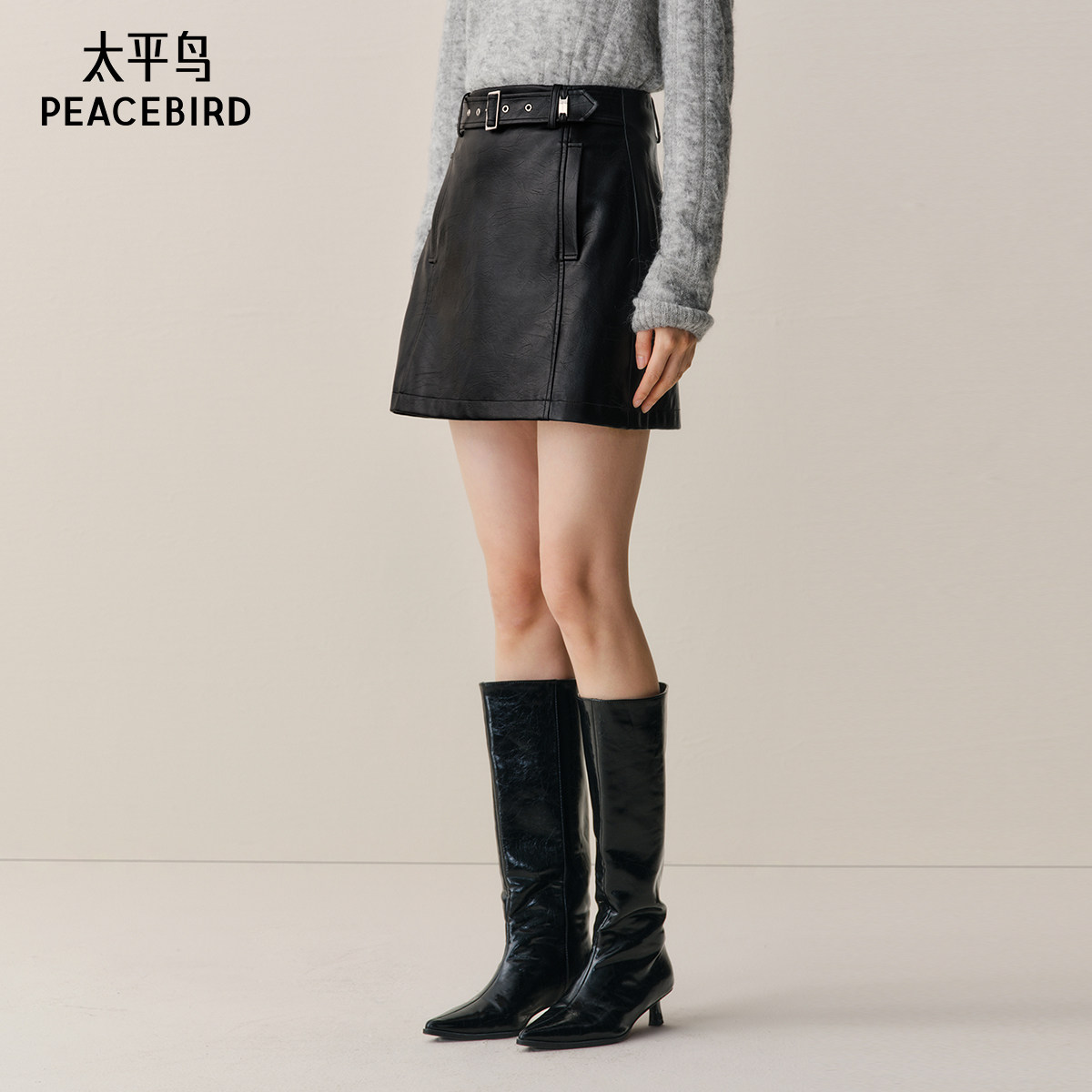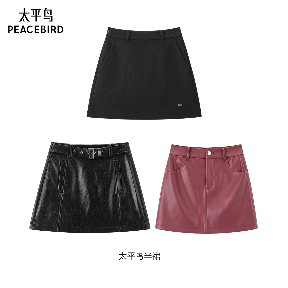 【达播专属】太平鸟黑色PU皮半身裙短裙磨毛半裙暗红色