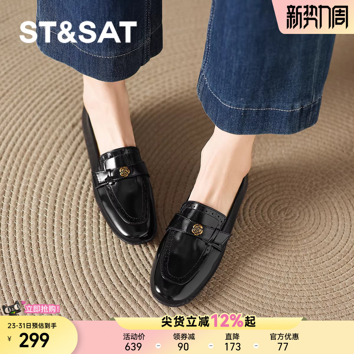 星期六山茶花乐福鞋女新款春季一脚蹬黑色平底工作鞋单鞋皮鞋