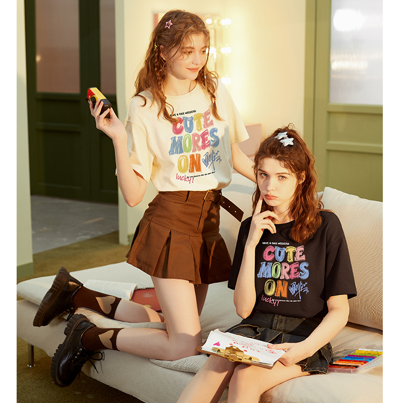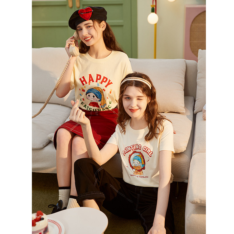 唐狮短袖女T恤衫夏季纯棉艺术家系列卡通蜡笔可爱短袖T恤减龄学生