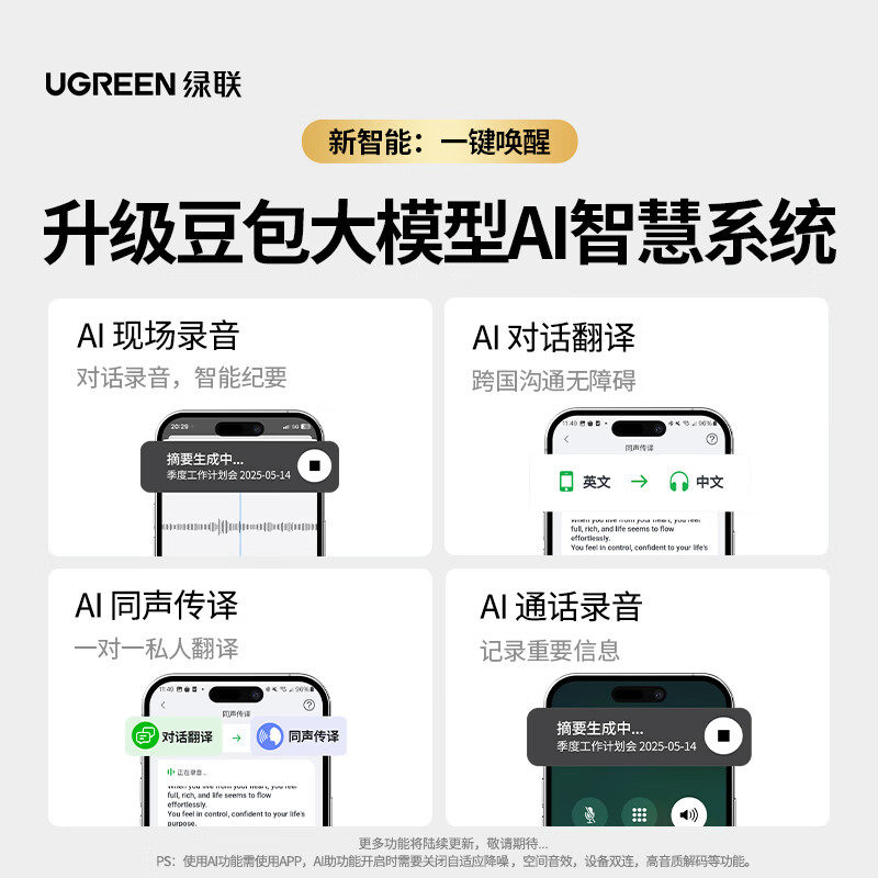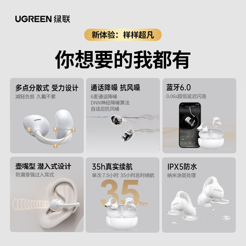 绿联S8夹耳式无线蓝牙耳机主动降噪AI翻译智能通话长续航新款