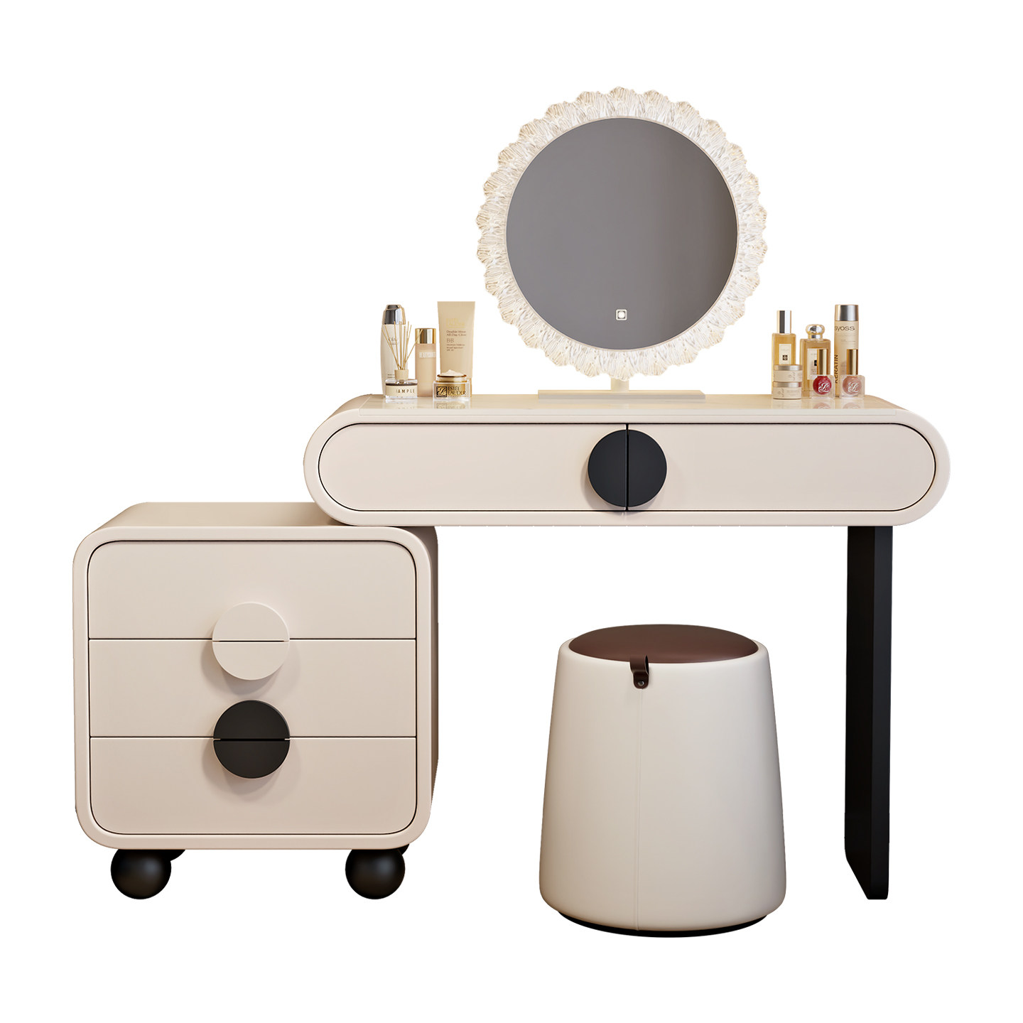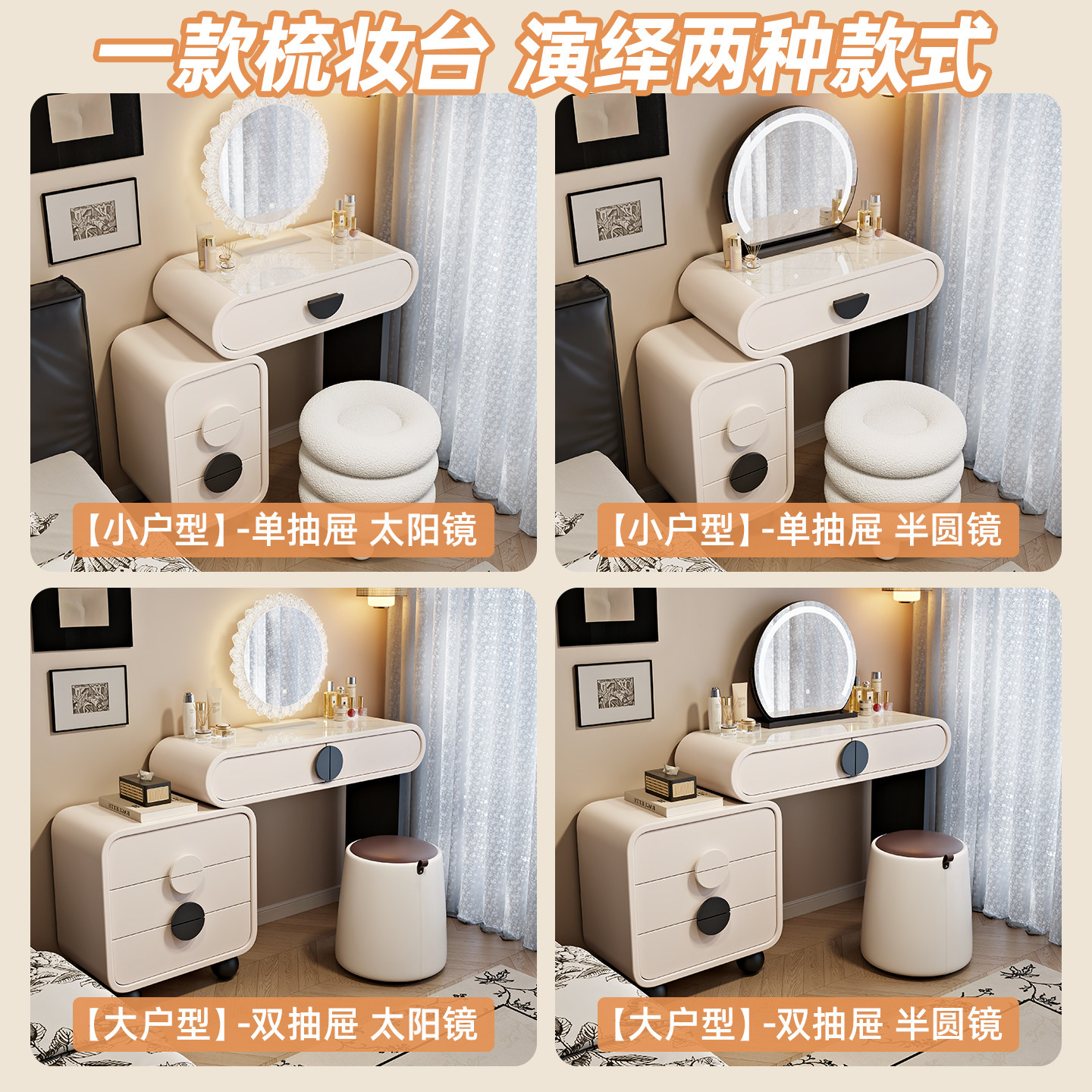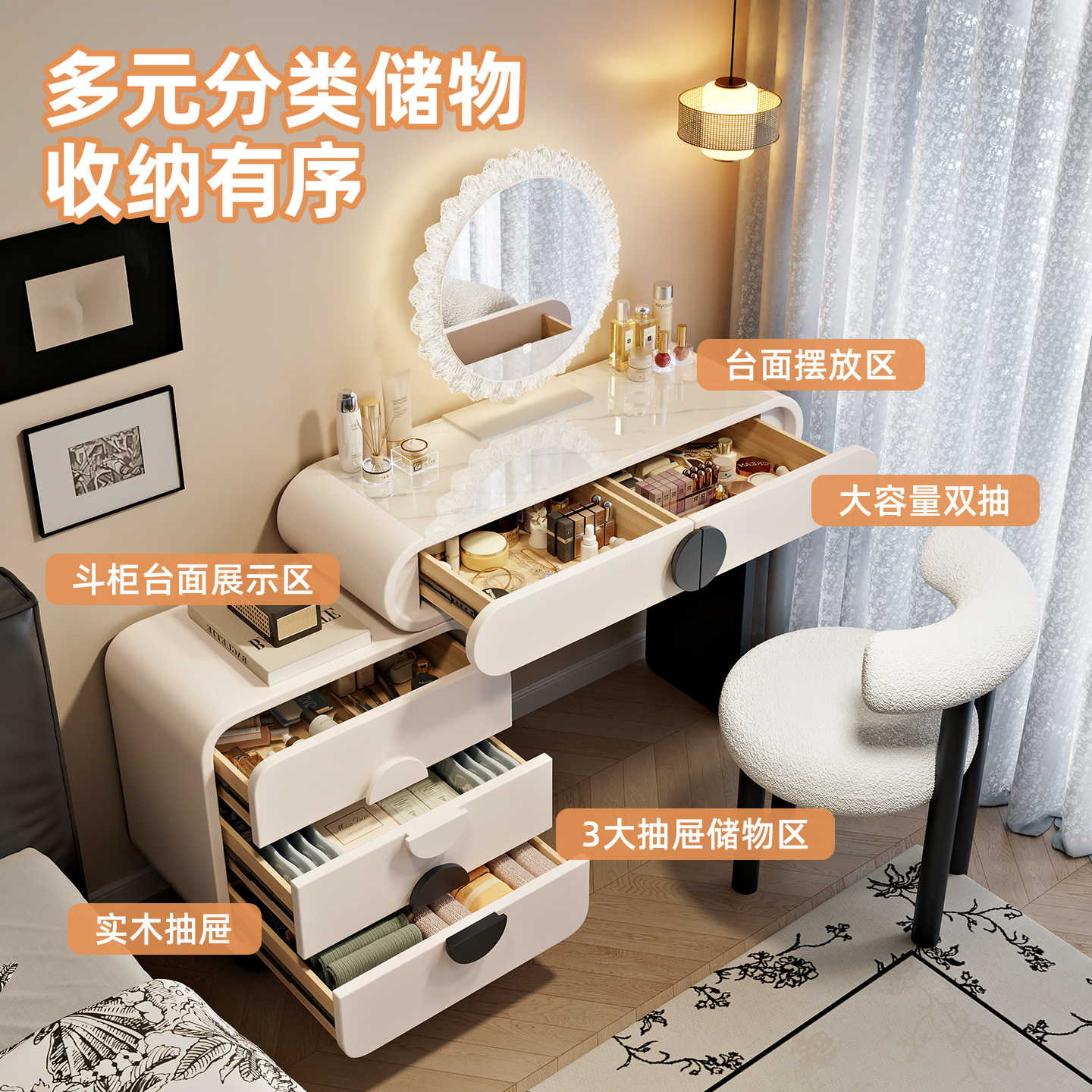 圆弧实木梳妆台斗柜一体2025新款现代简约卧室化妆桌奶油风化妆台