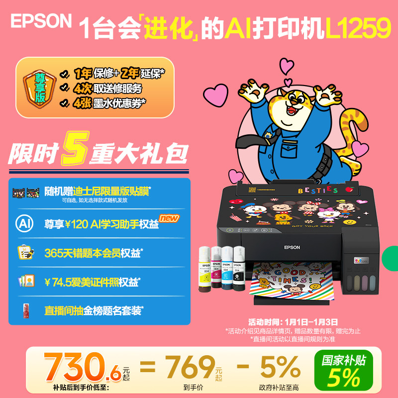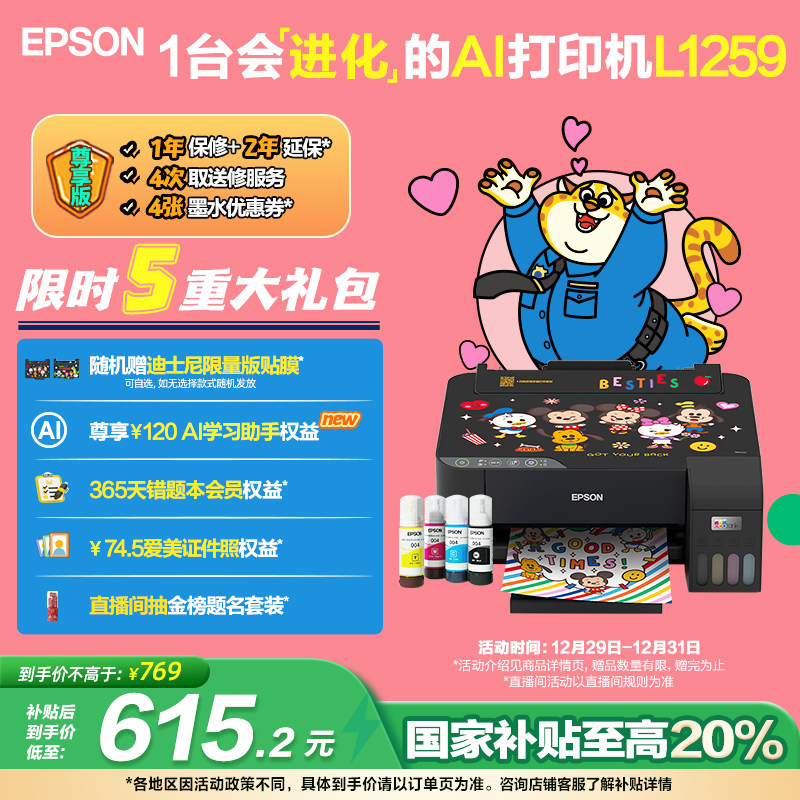 【政府补贴】爱普生Epson L1259/L125X墨仓式打印机照片作业打印无线直连智能配网小程序扫描复印