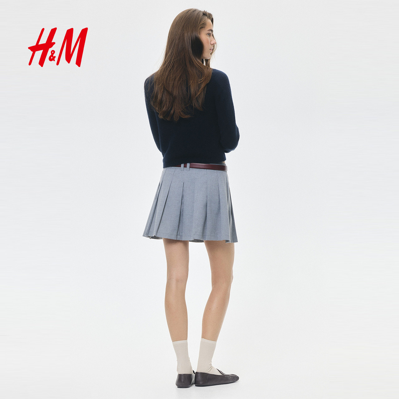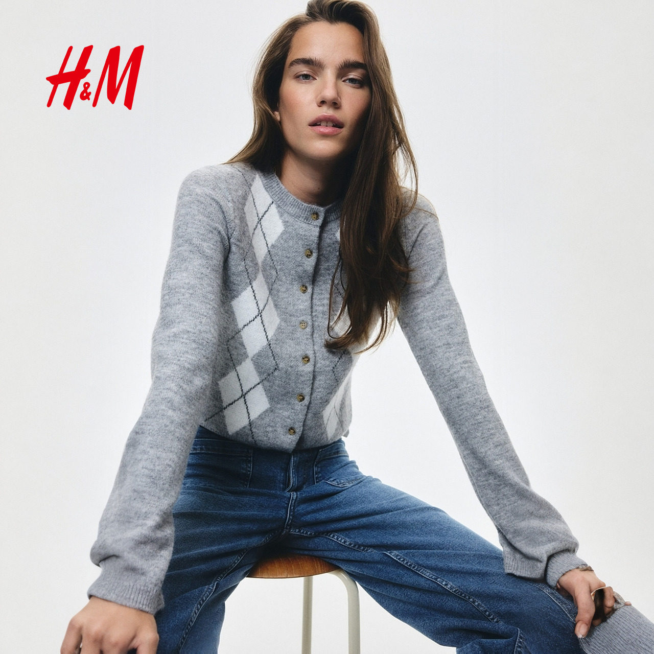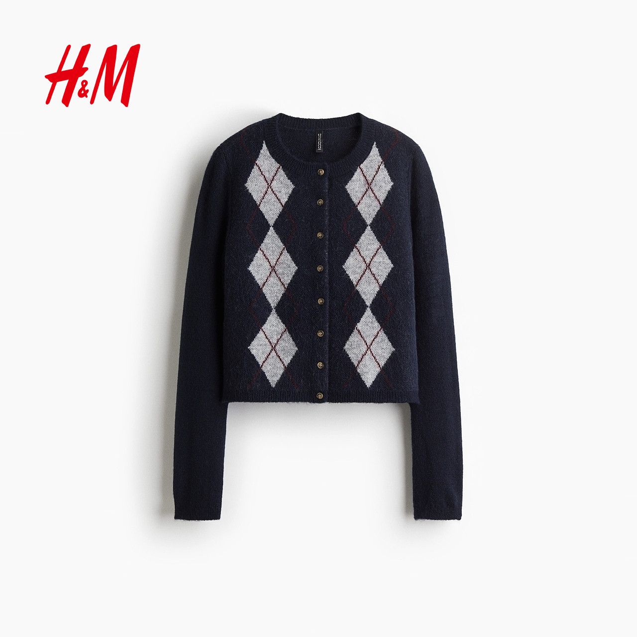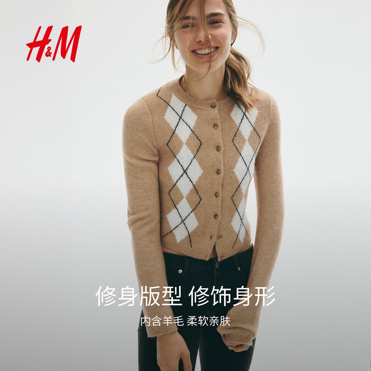 HM女装毛针织衫2025年冬季新款圆领慵懒提花菱格开衫外套1296842