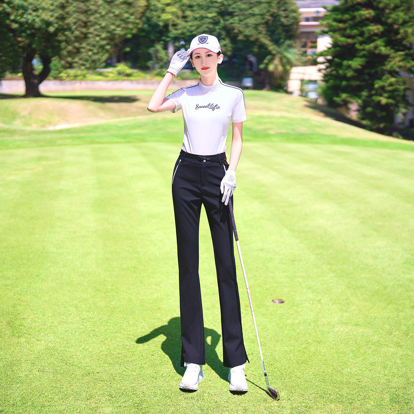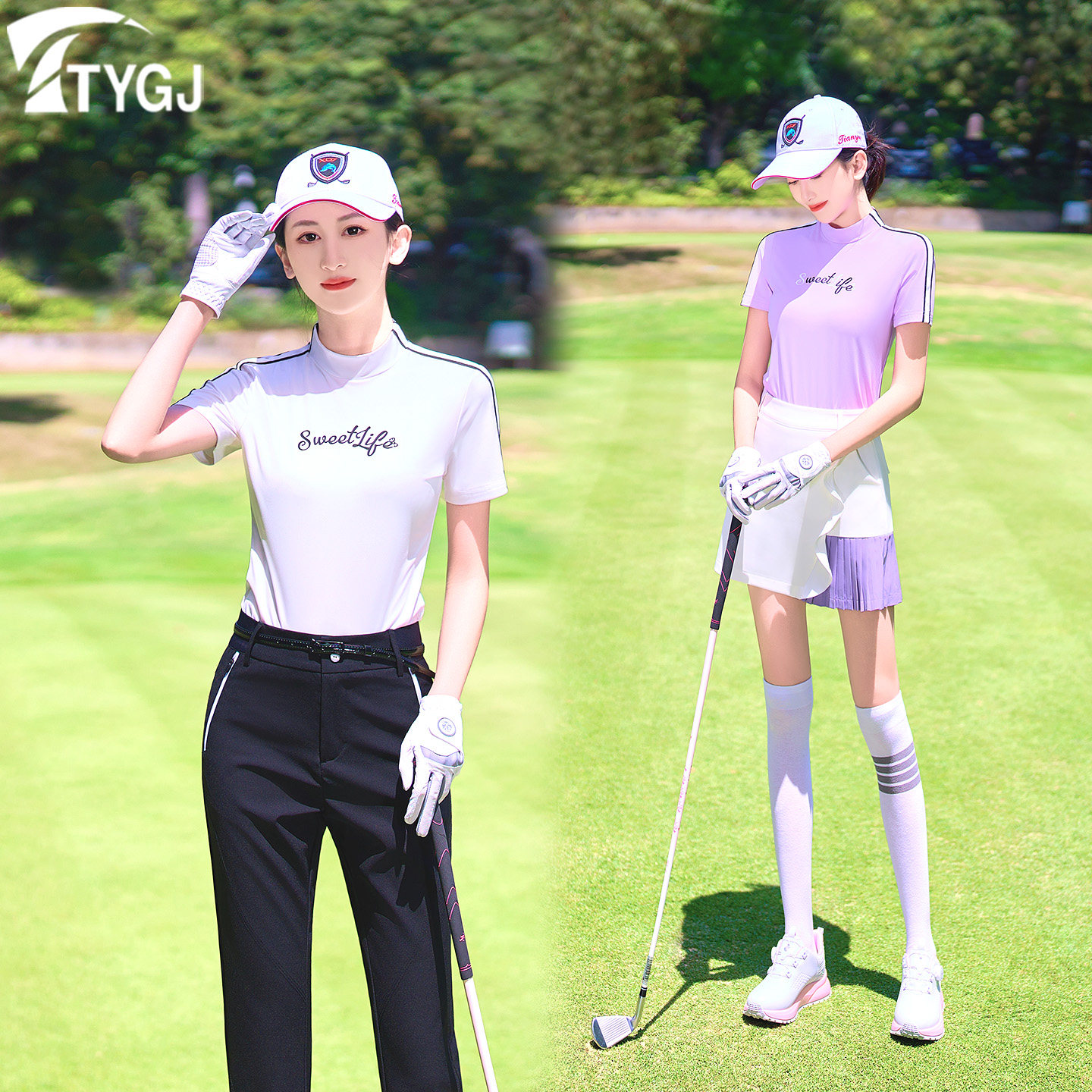 2025春夏新款高领修身运动速干T恤女士短袖上衣白紫色高尔夫服装