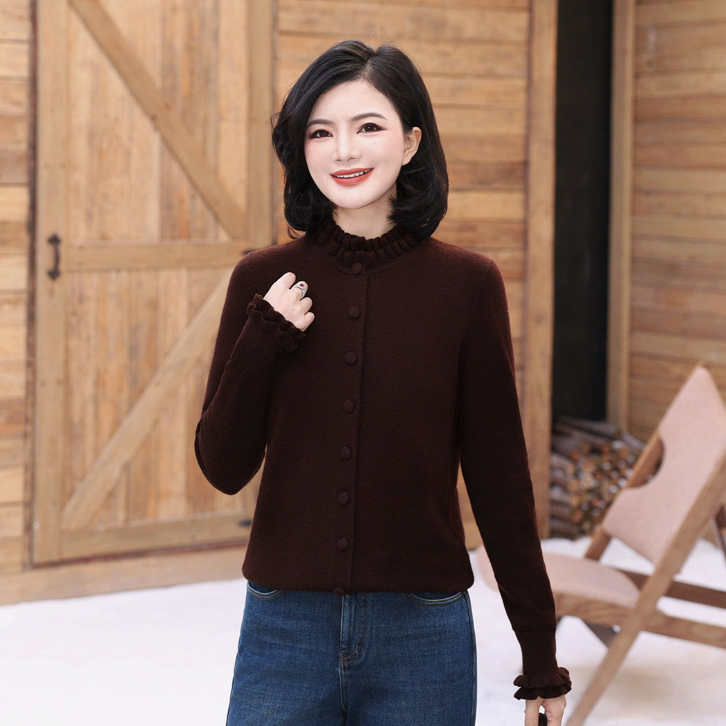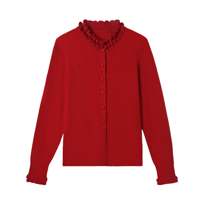 枫竺木耳边拼接立领羊毛针织开衫女秋冬高级感静奢红色打底毛衣
