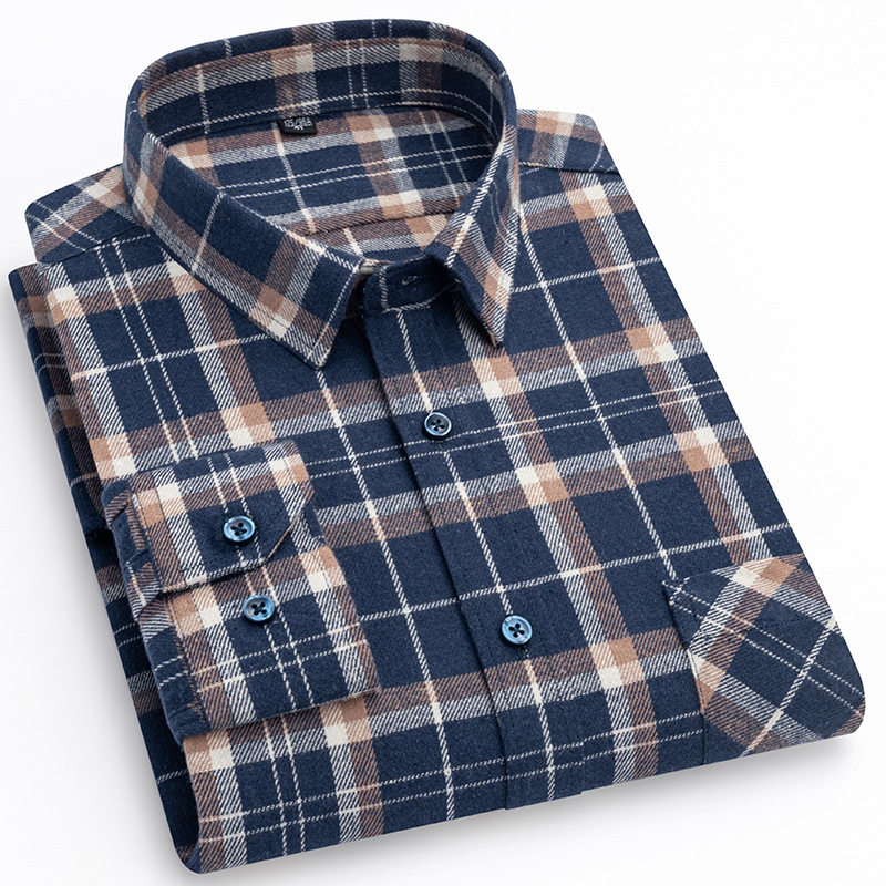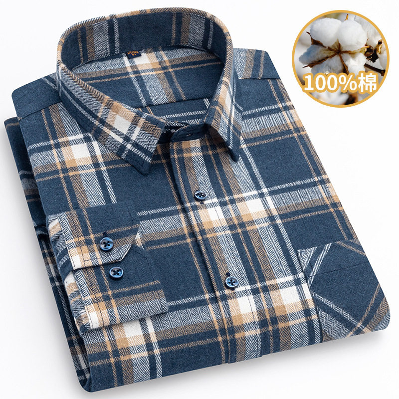 啄木鸟秋季新款男士长袖100%全纯棉磨毛格子衬衫 高级感休闲衬衣