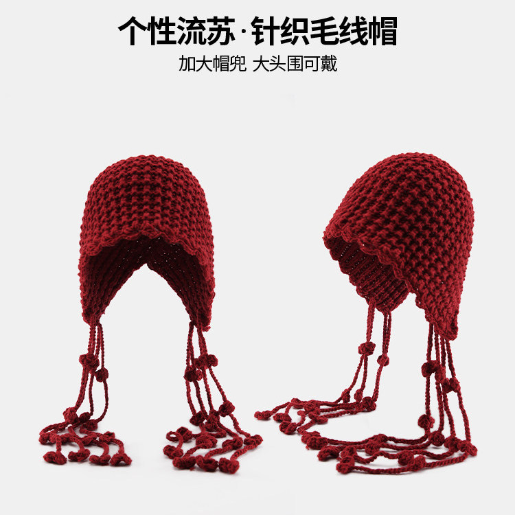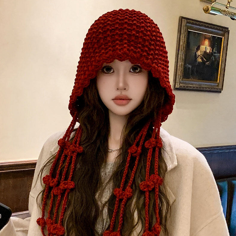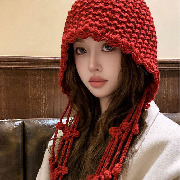 Classy key新加坡设计师联名款流苏红色毛线帽护耳保暖包头针织帽