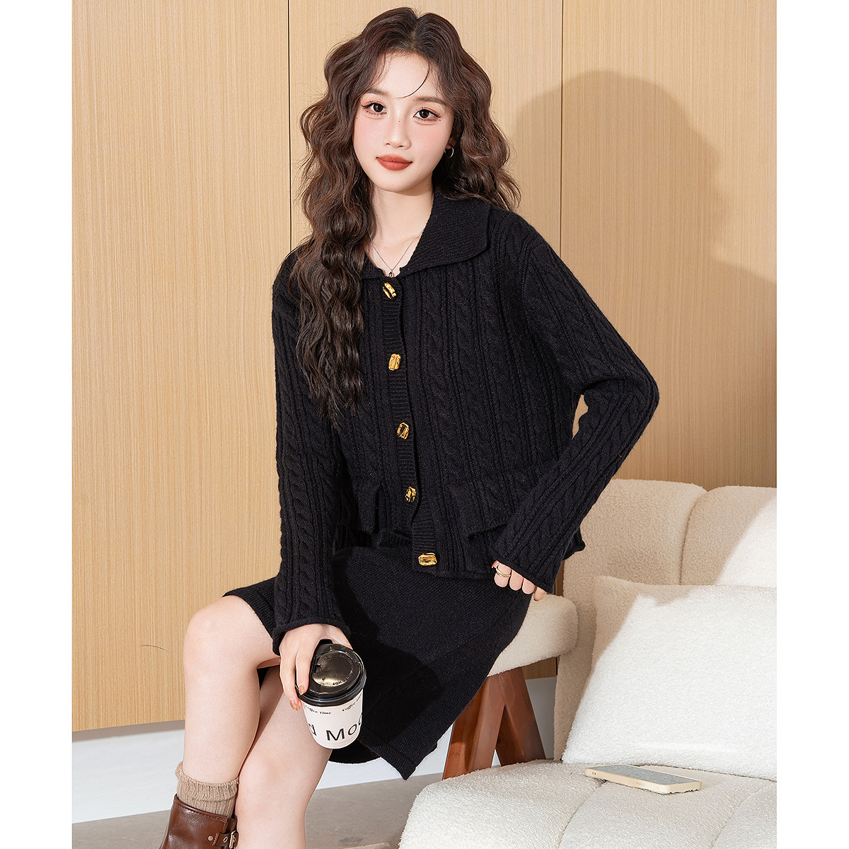 唐狮小香风套装女春装新款毛衣外套半身裙套装气质黑色两件套TD