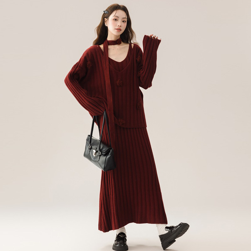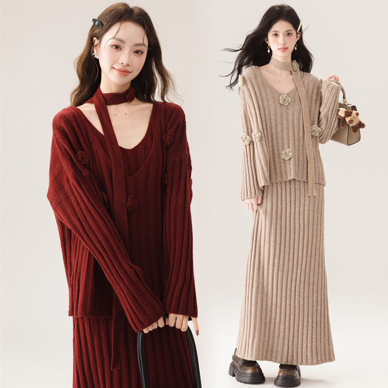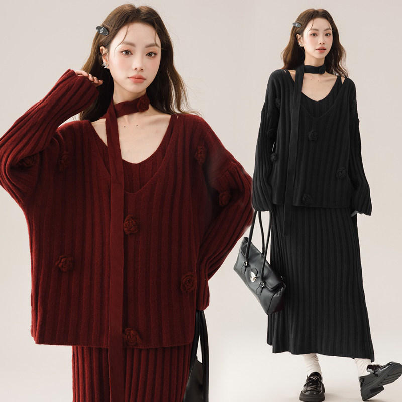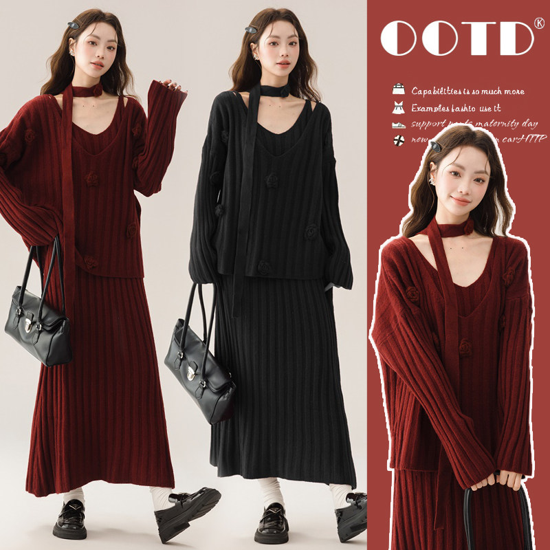 婧麒孕妇装连衣裙子2025新款秋冬法式山茶花时尚洋气宽松毛衣套装