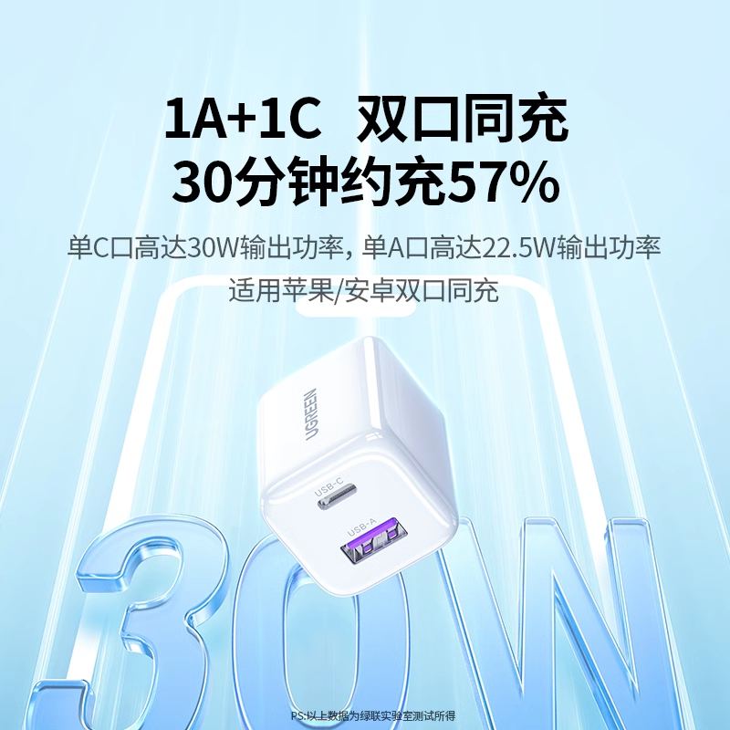 绿联30W双口氮化镓充电器线适用于iPhone17promax充电头iPhone16手机多口pd快充usbc插头iPad安卓一套装多口