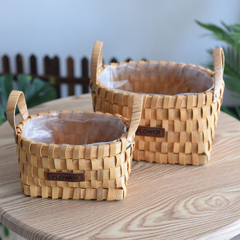 纯木片手提花篮田园插花篮子草编藤编篮子手工编织装饰竹编装饰品