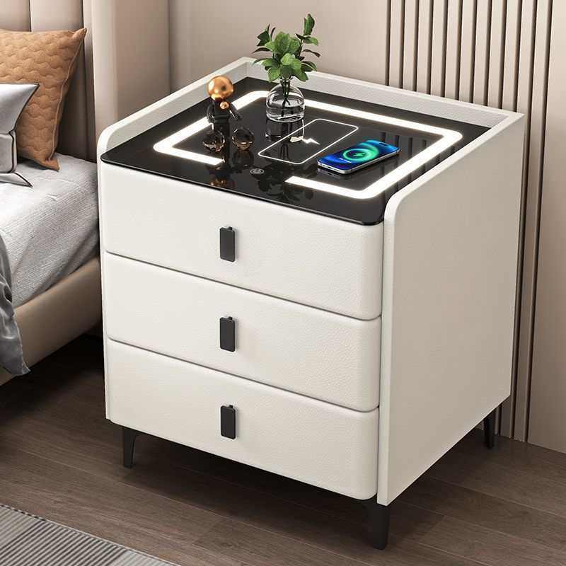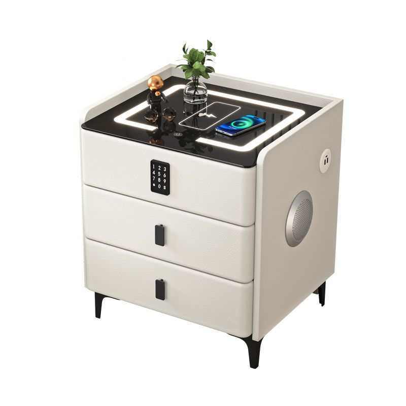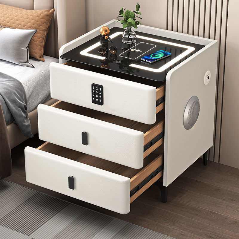 实木床头柜智能简约无线充带灯指纹锁多功能床边柜皮革整装多功能