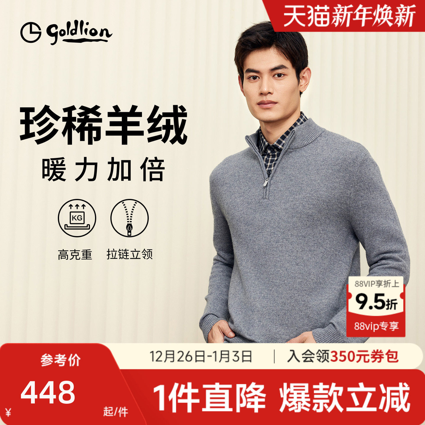 【含羊绒羊毛】金利来秋冬新款毛衣男士半拉链立领商务休闲针织衫