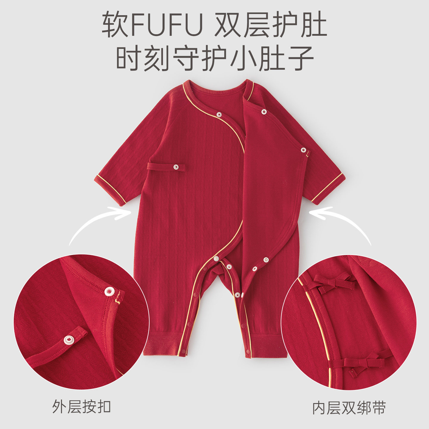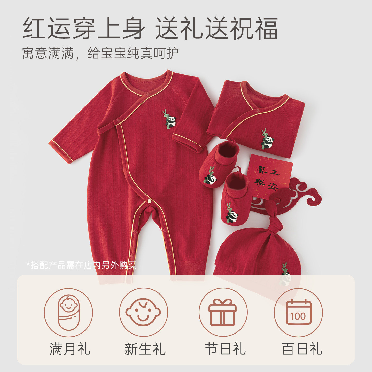 木生棉新生儿纯棉连体衣秋冬季宝宝喜庆红色哈衣无骨满月服和尚服
