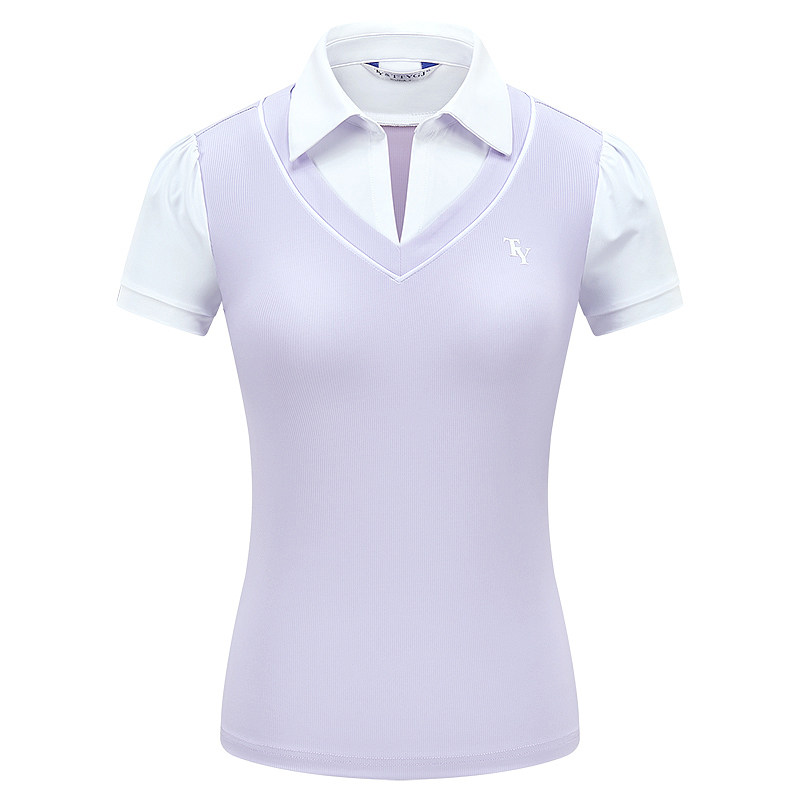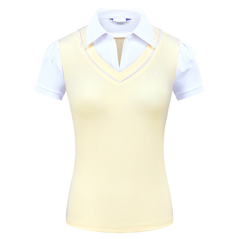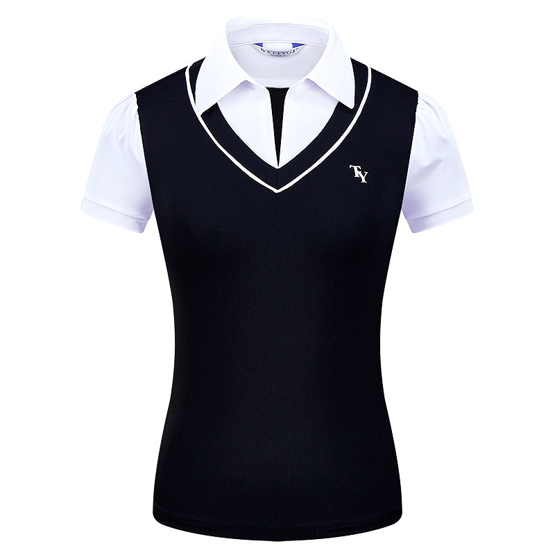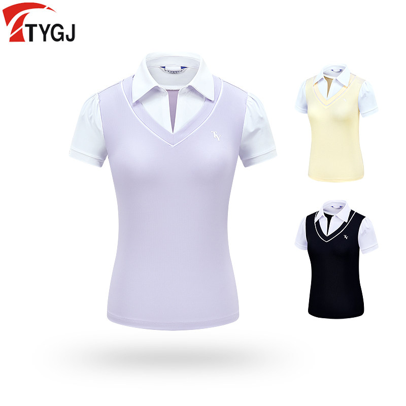春夏新款高尔夫球女士短袖T恤衫速干学院风V领假两件运动上衣服