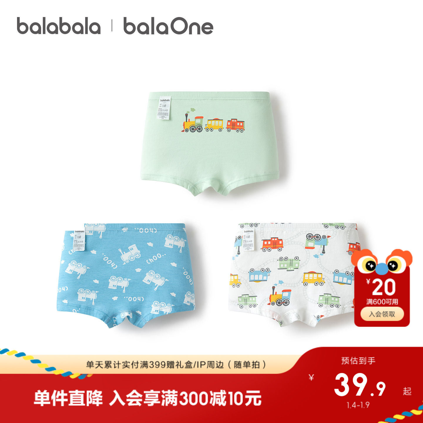 【balaOne】巴拉巴拉儿童内裤棉男童不夹pp抗菌裆四角短裤三条装