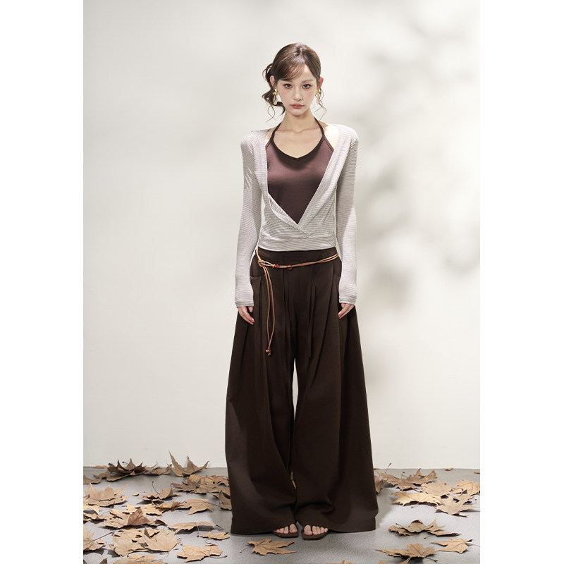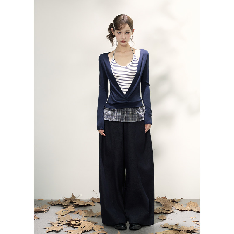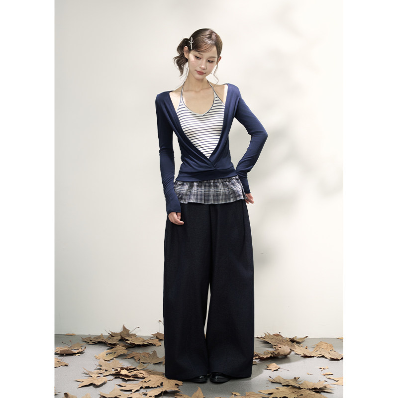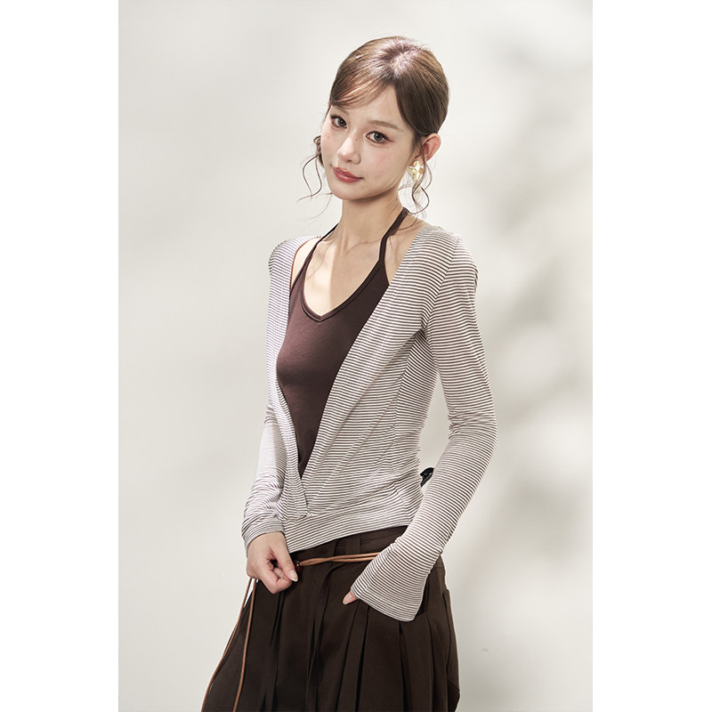 AXIA假两件长袖针织衫女春秋挂脖式横条纹甜辣风显瘦大V领T恤上衣