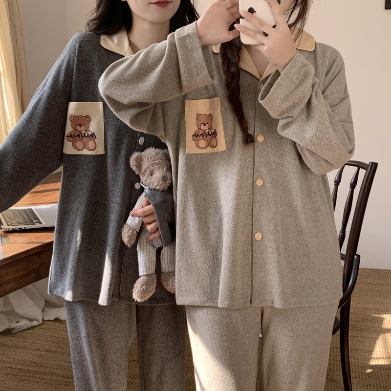 安比斯情侣睡衣舒适纯棉秋季女长袖男女同款休闲家居服套装可出门