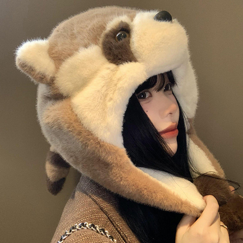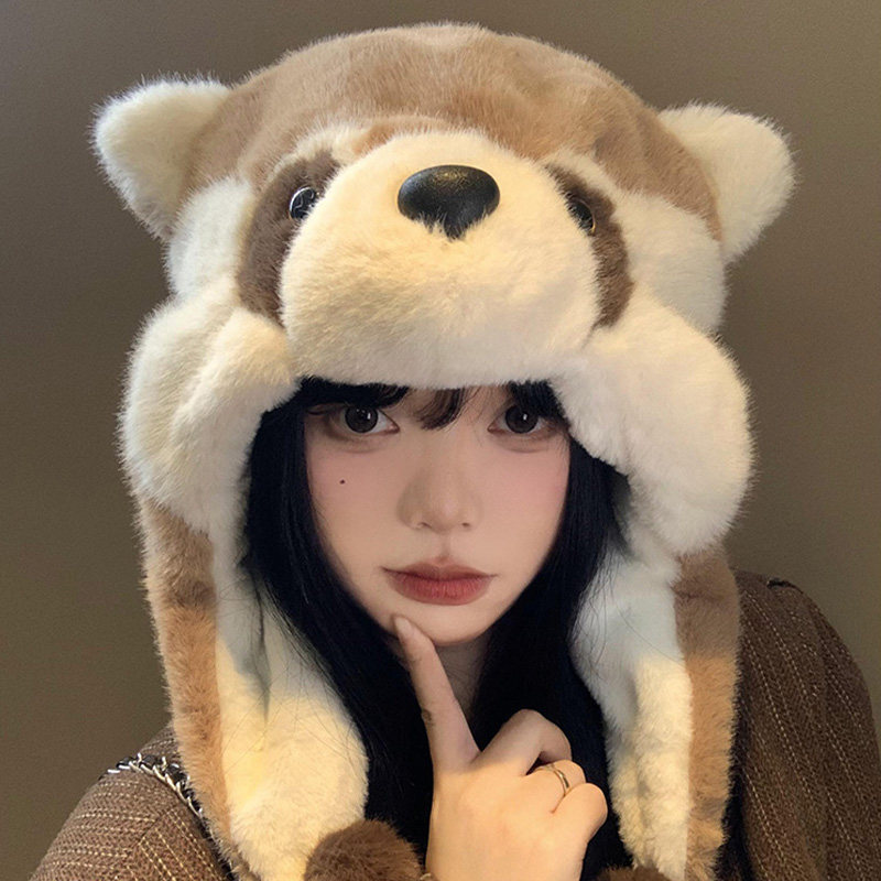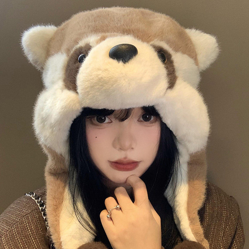 可爱卡通小浣熊毛绒帽女秋冬季显脸小护耳帽保暖加厚防寒雷锋帽子