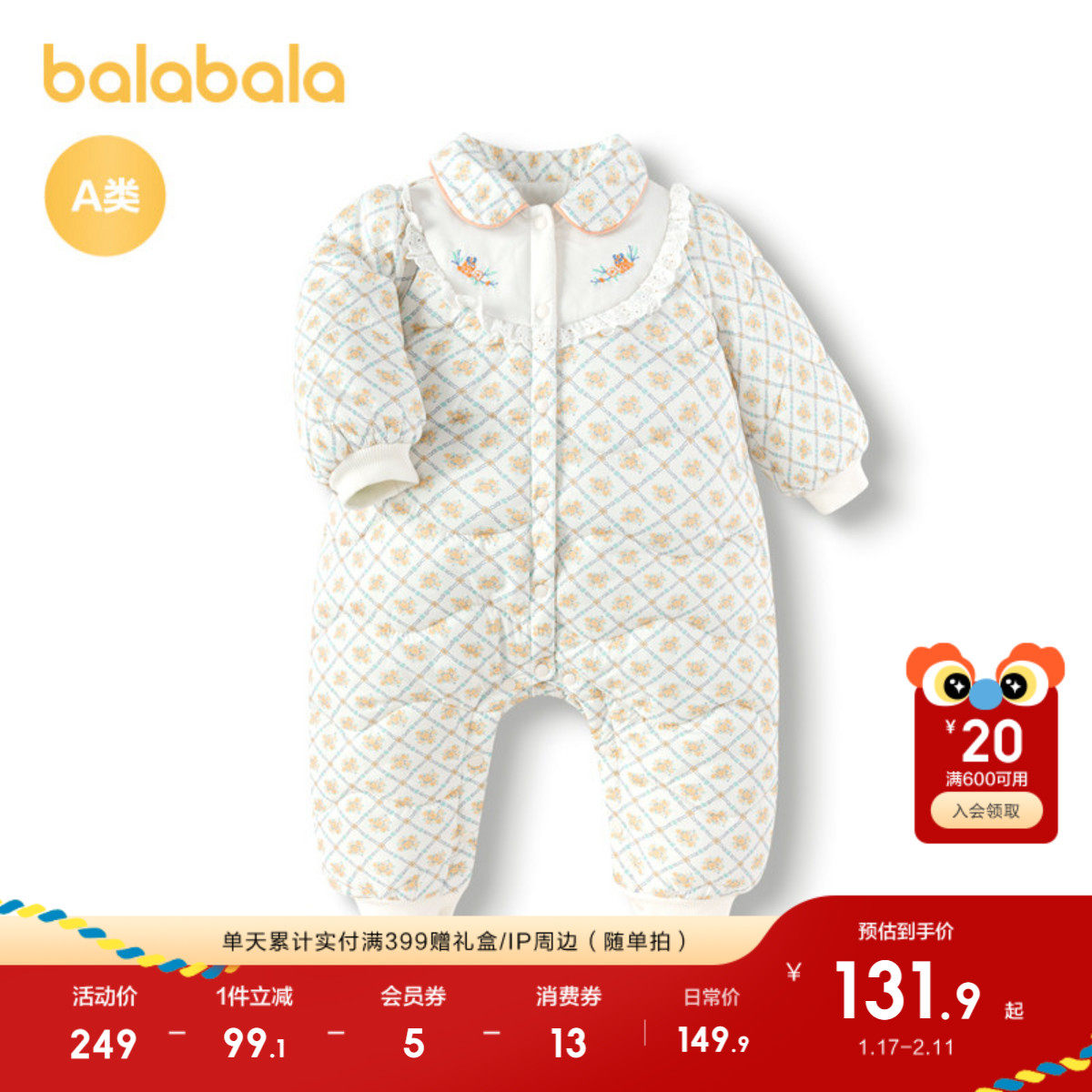 巴拉巴拉宝宝外出连体衣女童哈衣包屁衣冬装精致翻领甜美时尚萌趣