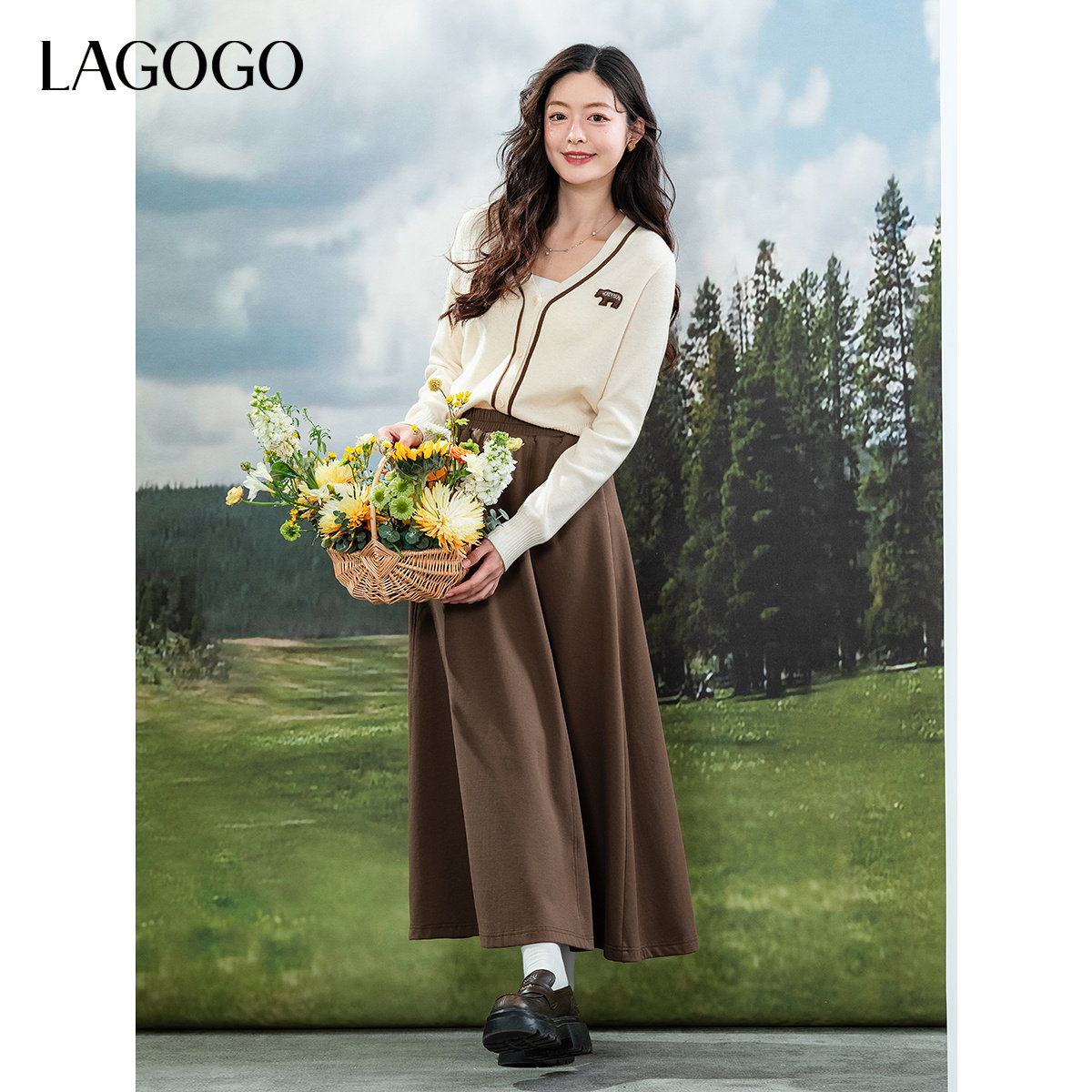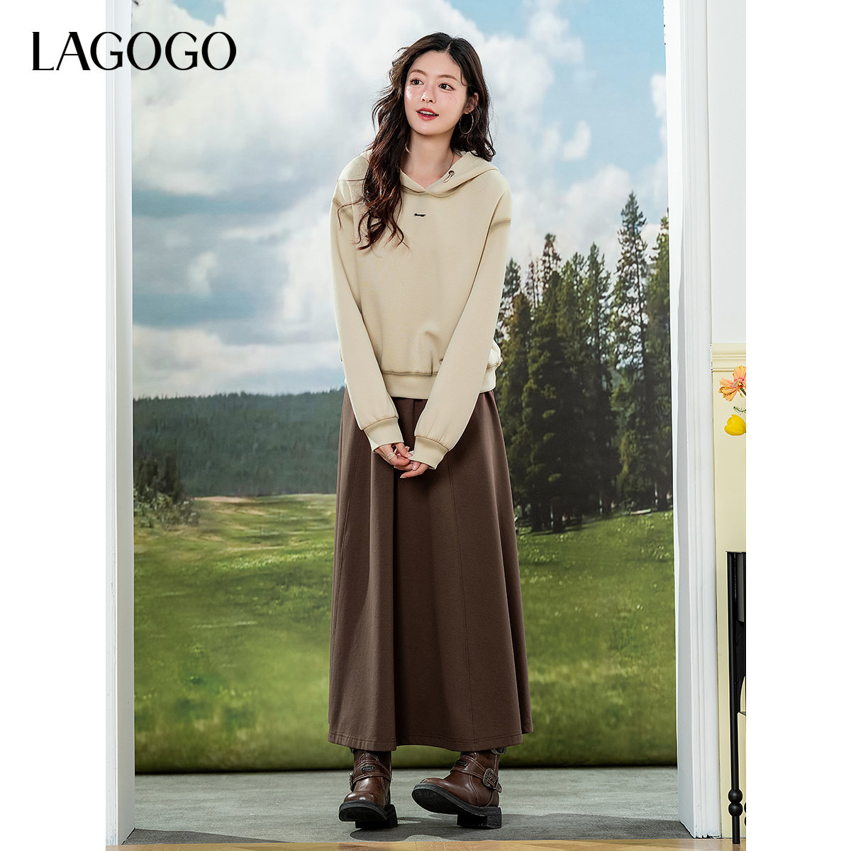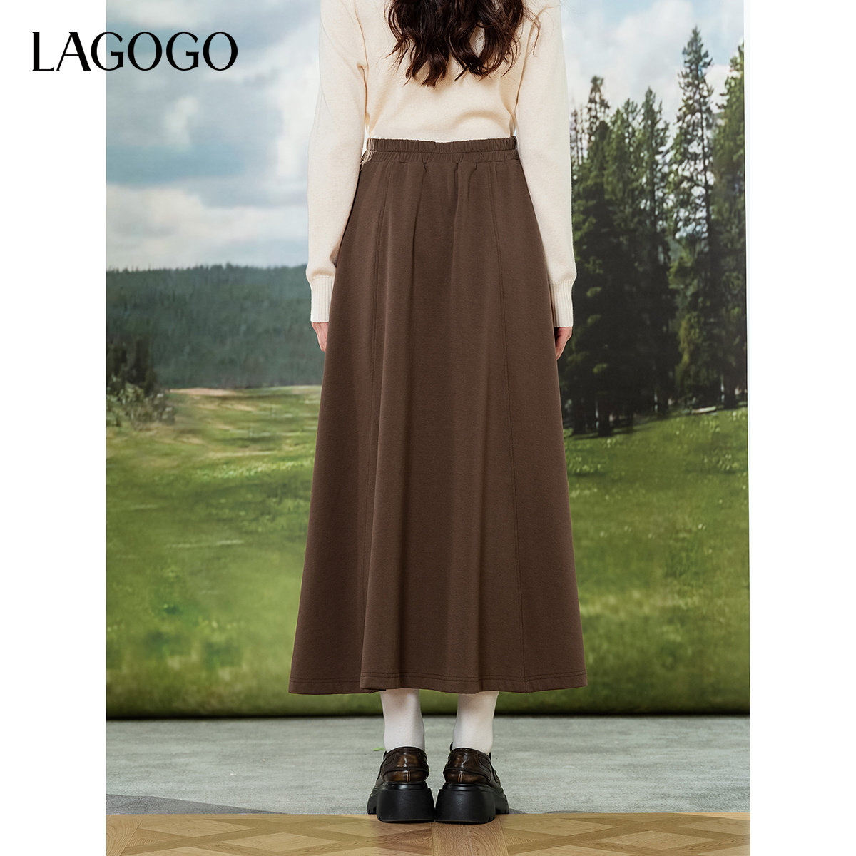 LAGOGO松紧高腰显瘦A字半身裙女拉谷谷2025春季新款复古简约长裙