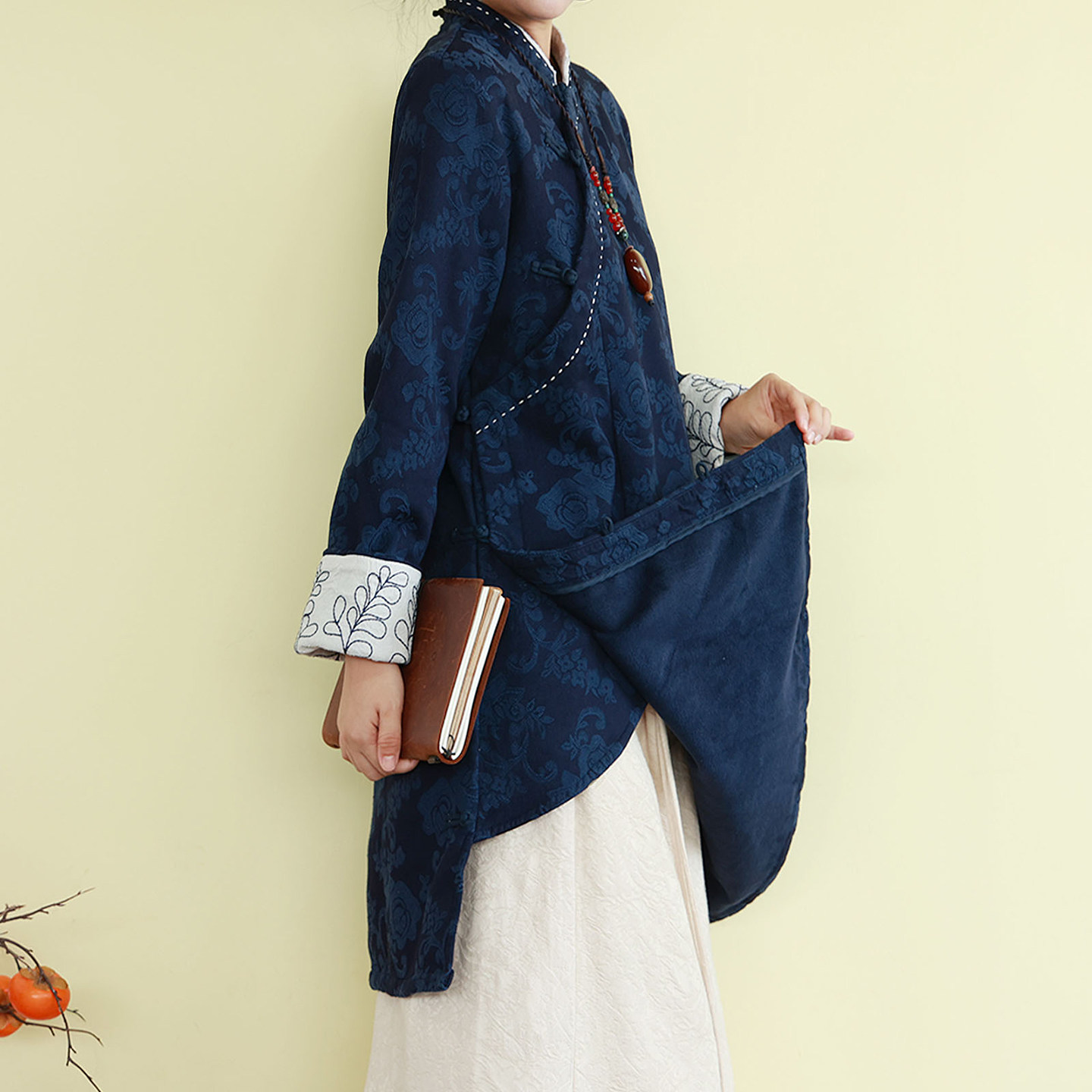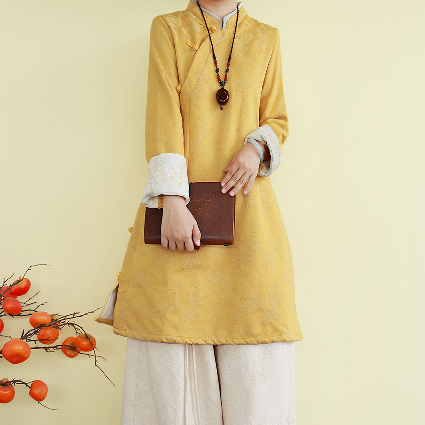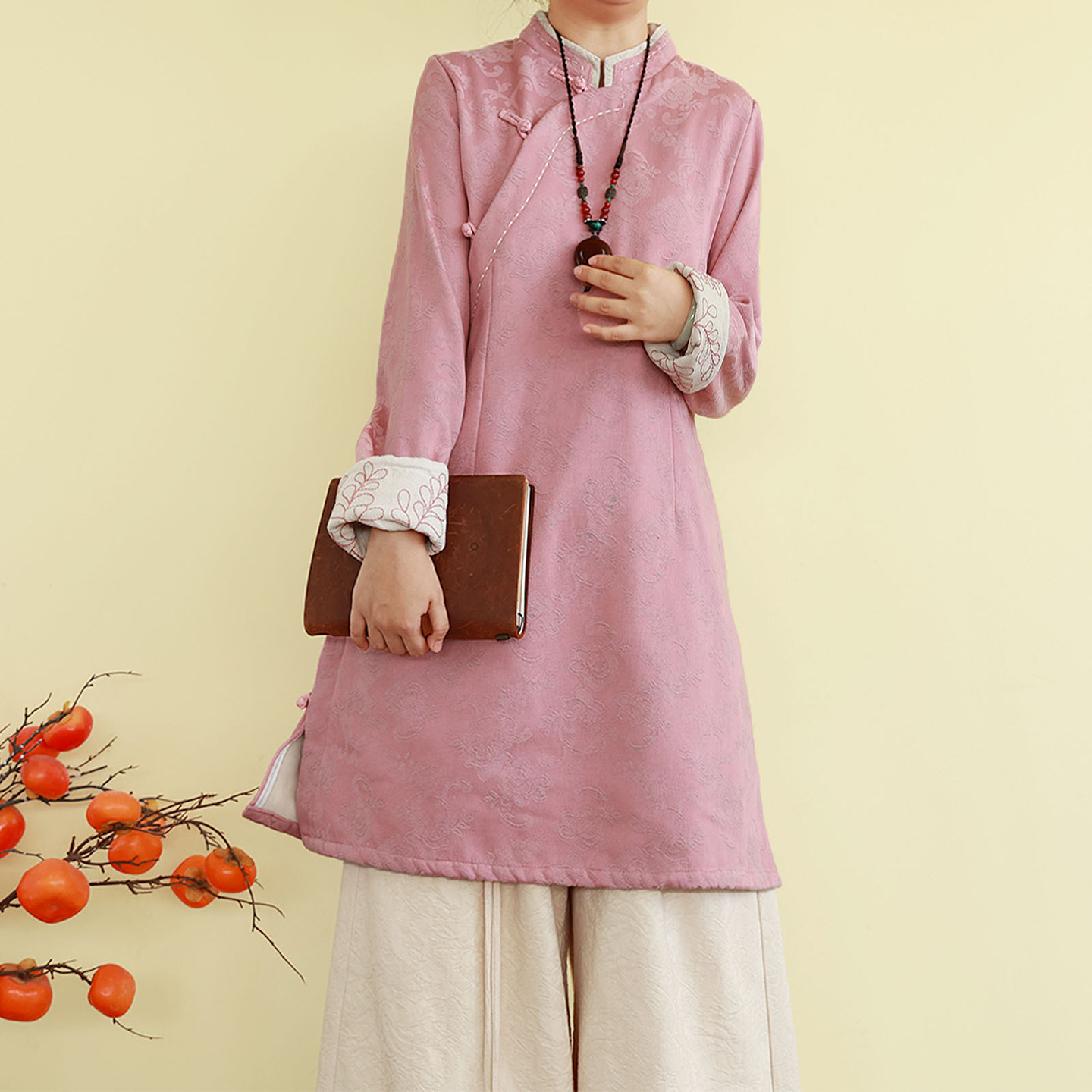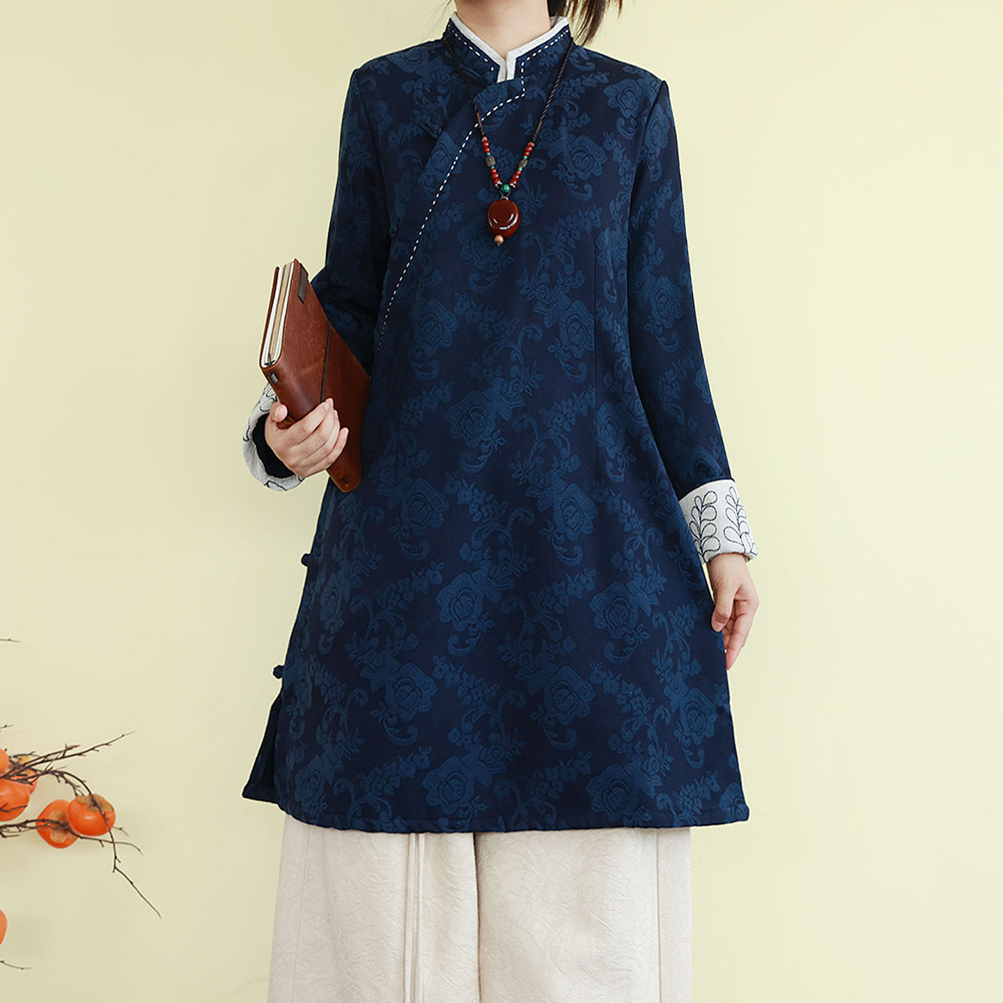复古民国风亚麻棉加绒提花刺绣衬衫秋冬季中长款立领上衣宽松茶服