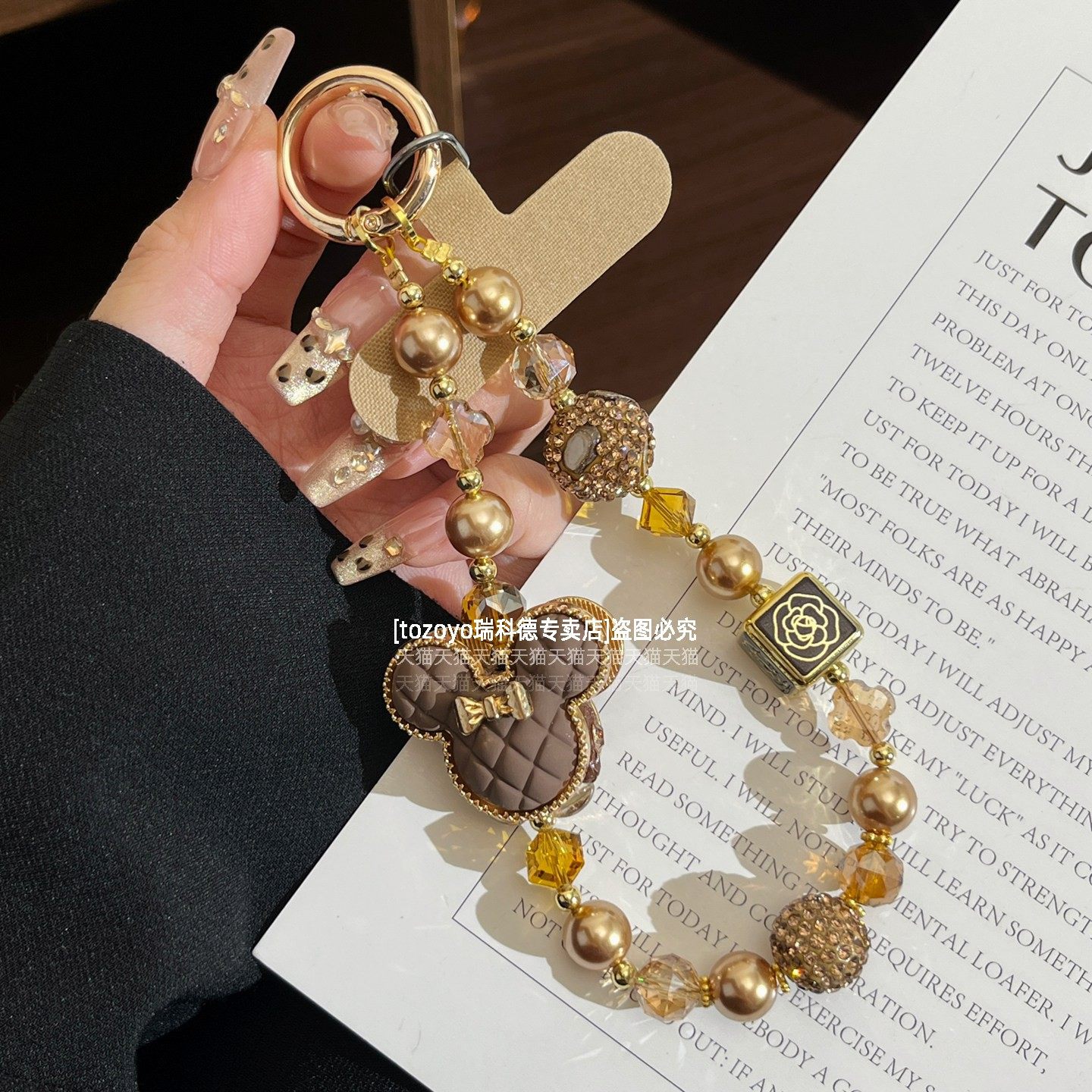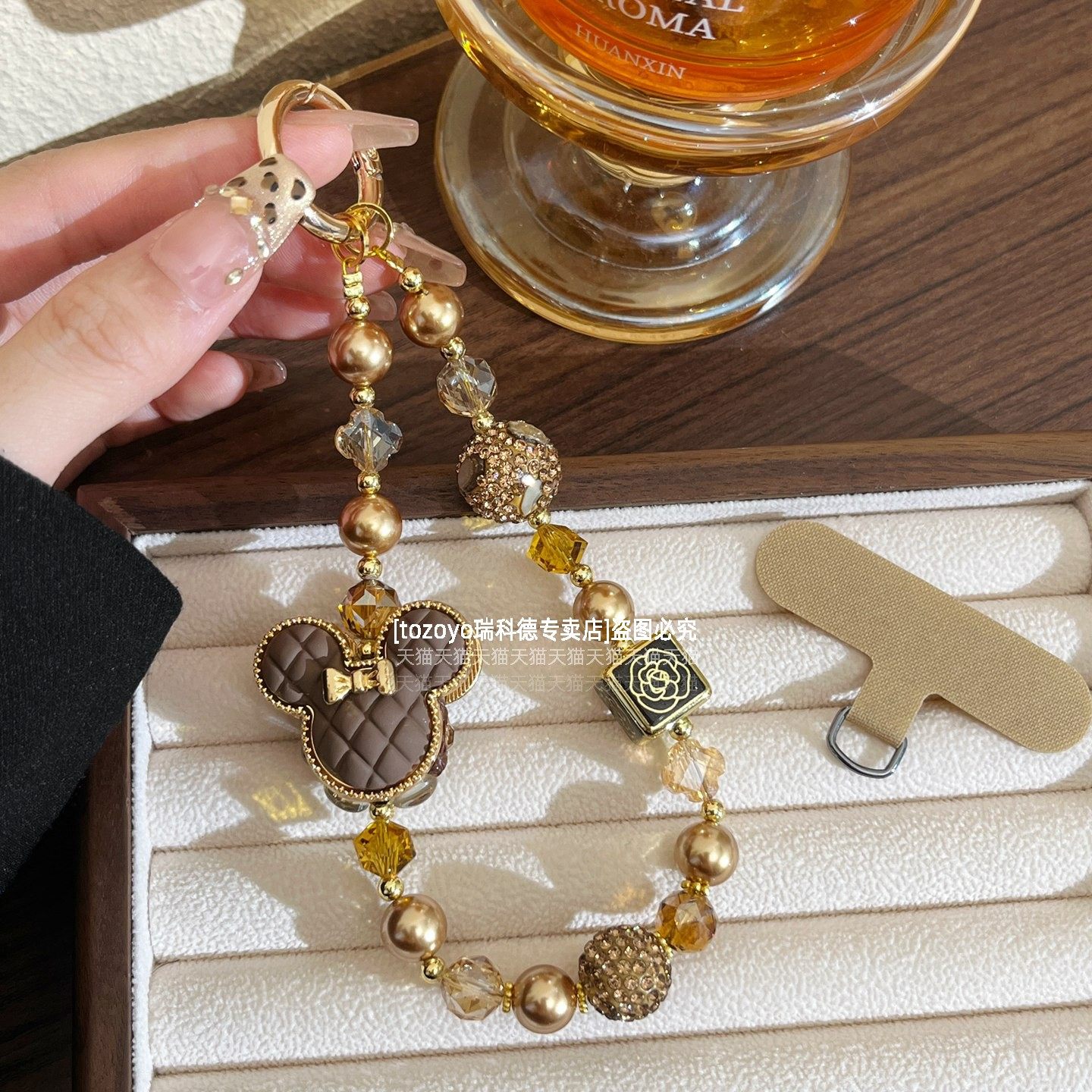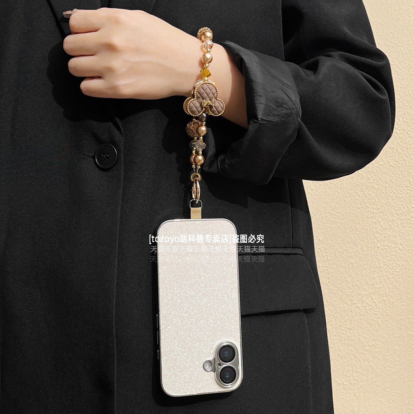 高级感美拉德大牌手机链轻奢精致金棕色珍珠水晶链条山茶花闪钻手腕挂链漂亮超好看手链小香风挂件包包串珠壳