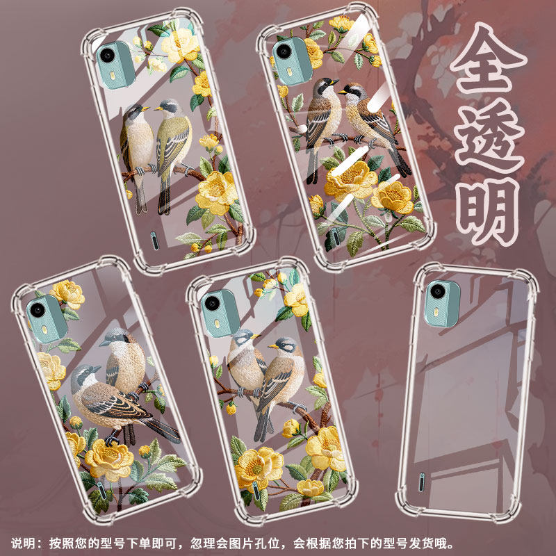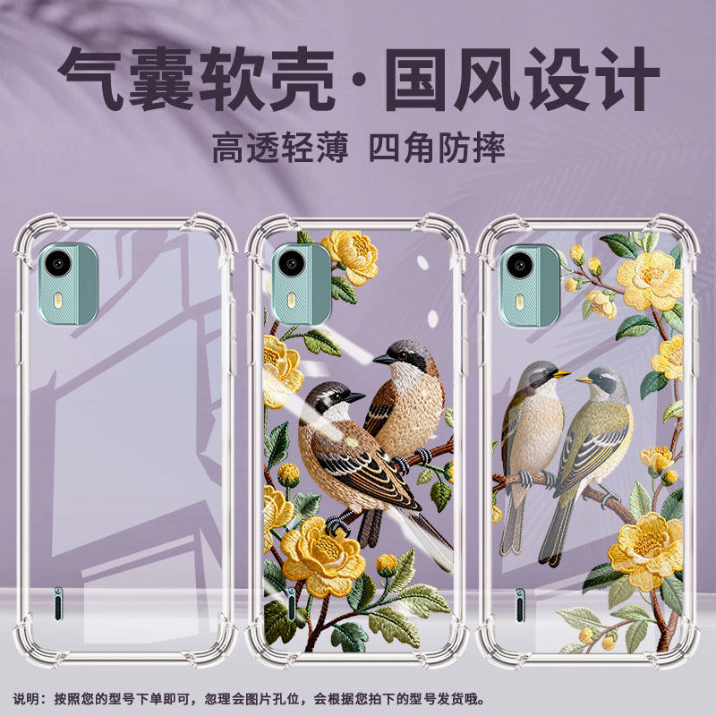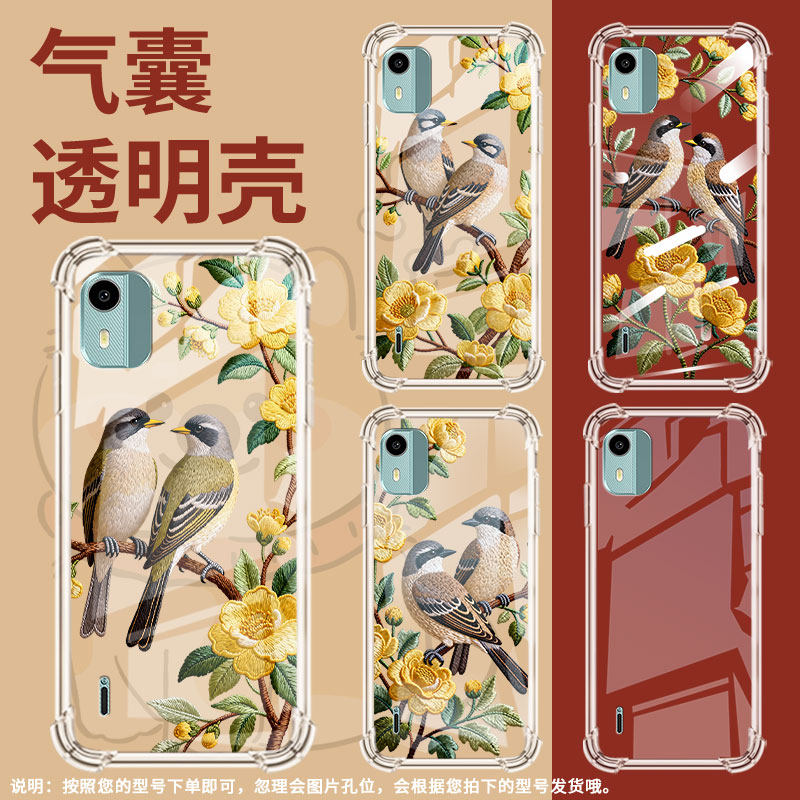 适用诺基亚C12Pro气囊手机壳诺基亚C12四角防摔刺绣花鸟NokiaC01Plus手机壳诺基亚C12+硅胶TA-1387保护套