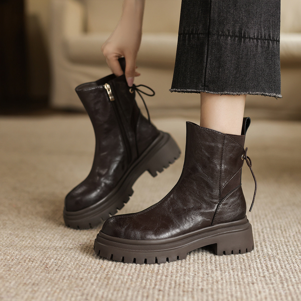阿么手工女鞋新款拼接后绑带牛皮厚底短靴秋冬粗跟圆头百搭靴子女