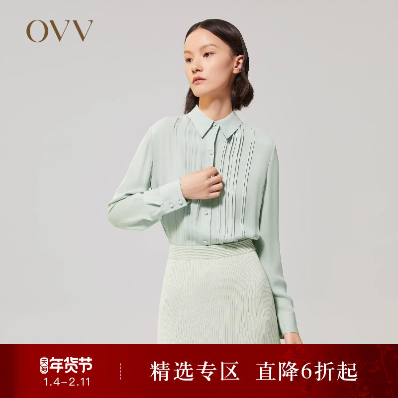 【重磅真丝】OVV秋冬女装19姆米双乔翻领百褶长袖衬衫