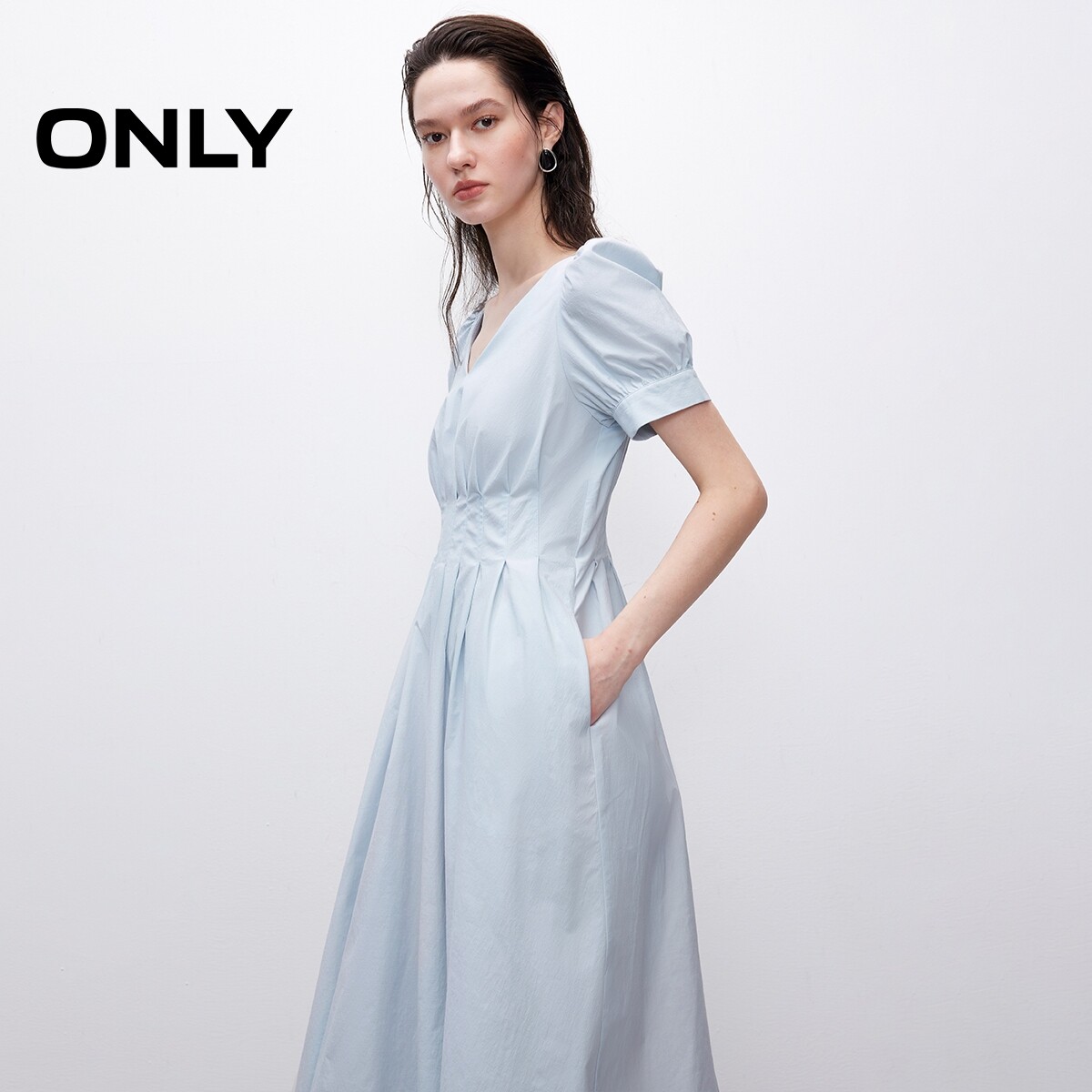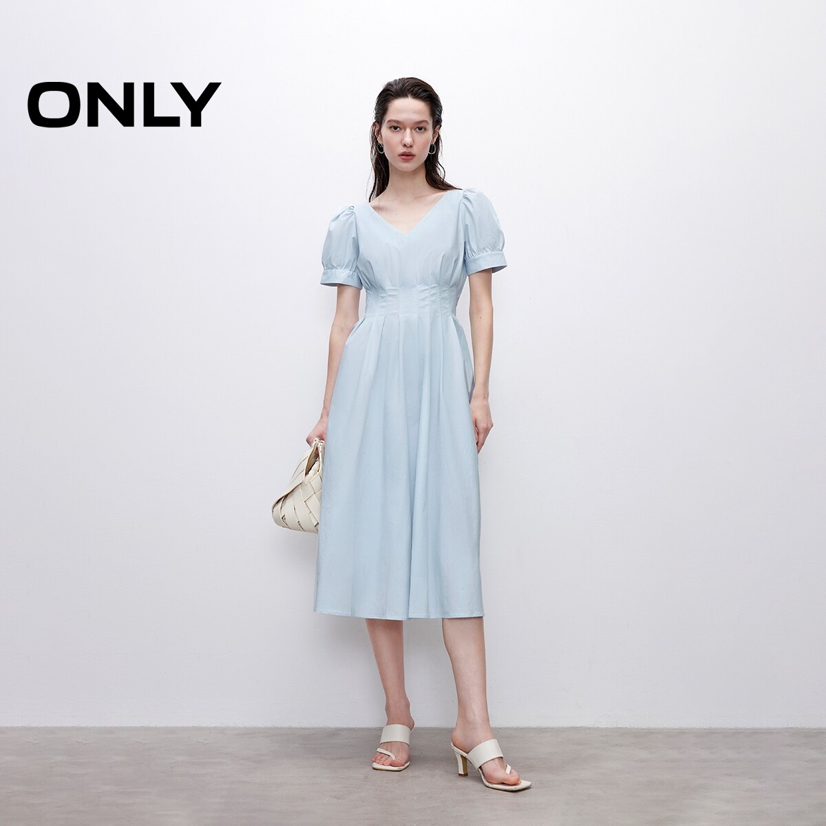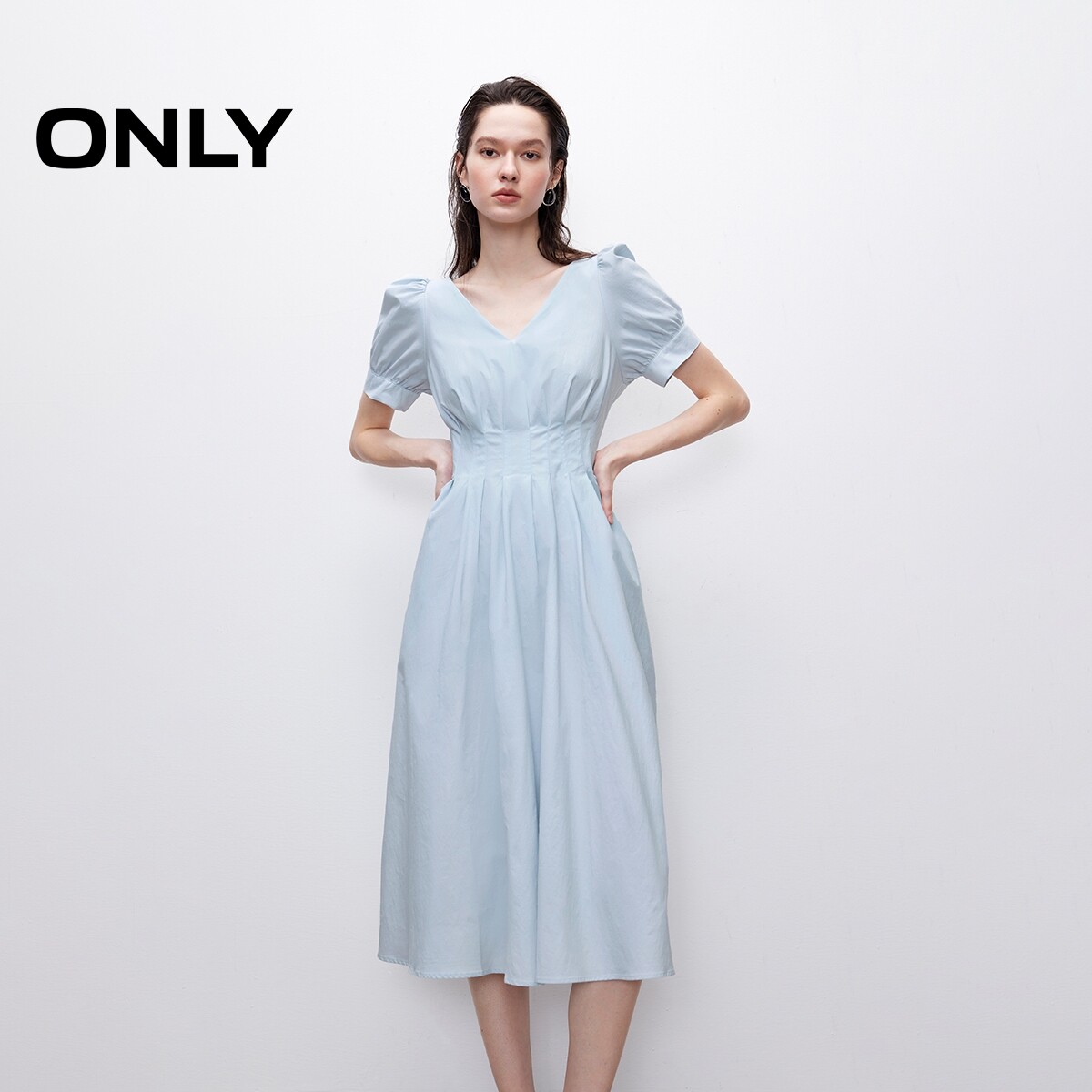 【ONLY奥莱】春季纯色高腰V领泡泡袖收腰显瘦中长裙短袖连衣裙女