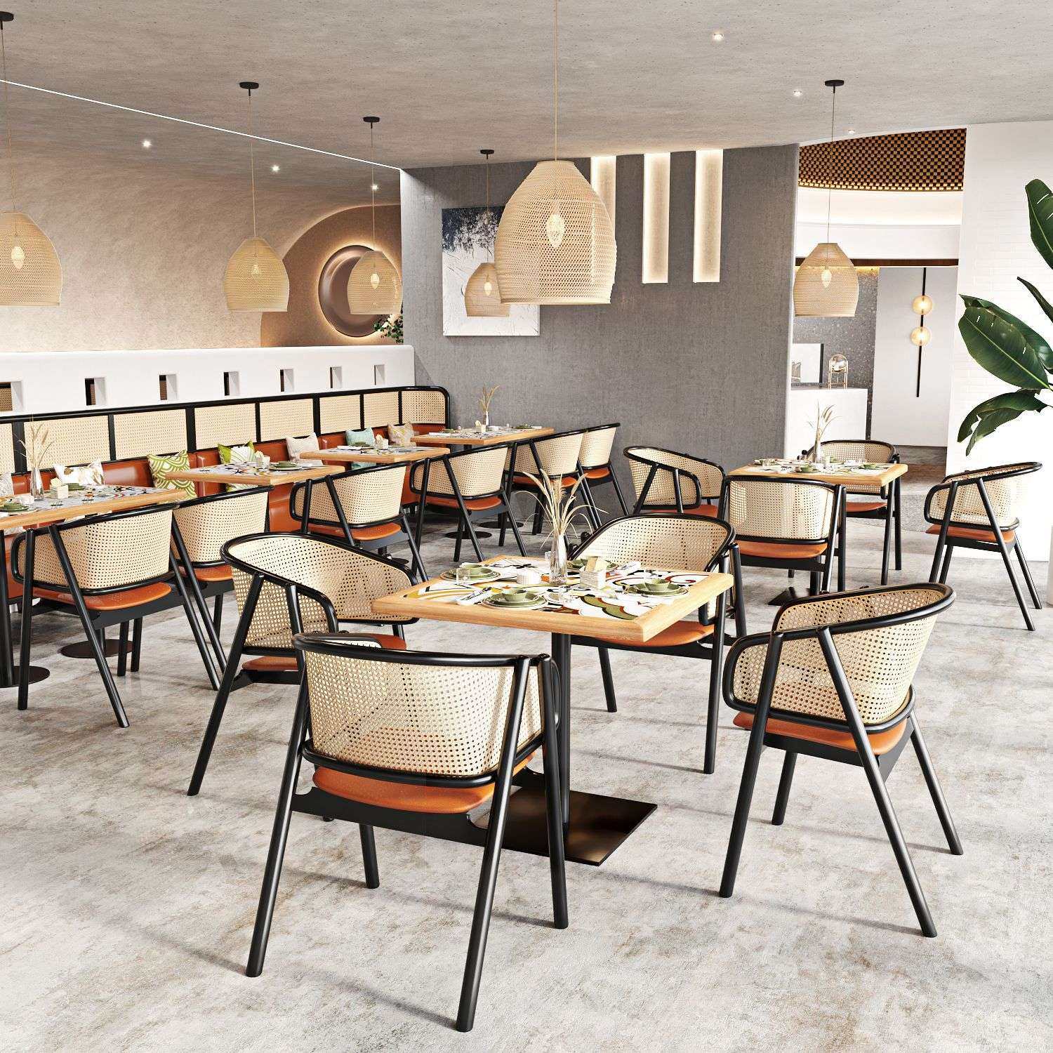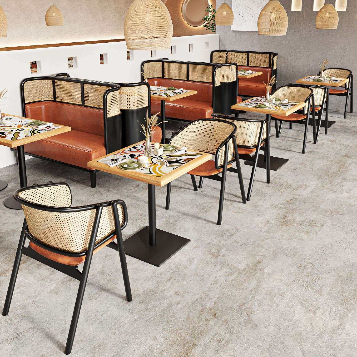 餐厅实木卡座编藤餐椅饭店东南亚咖啡厅家用长桌饭桌餐桌大理石