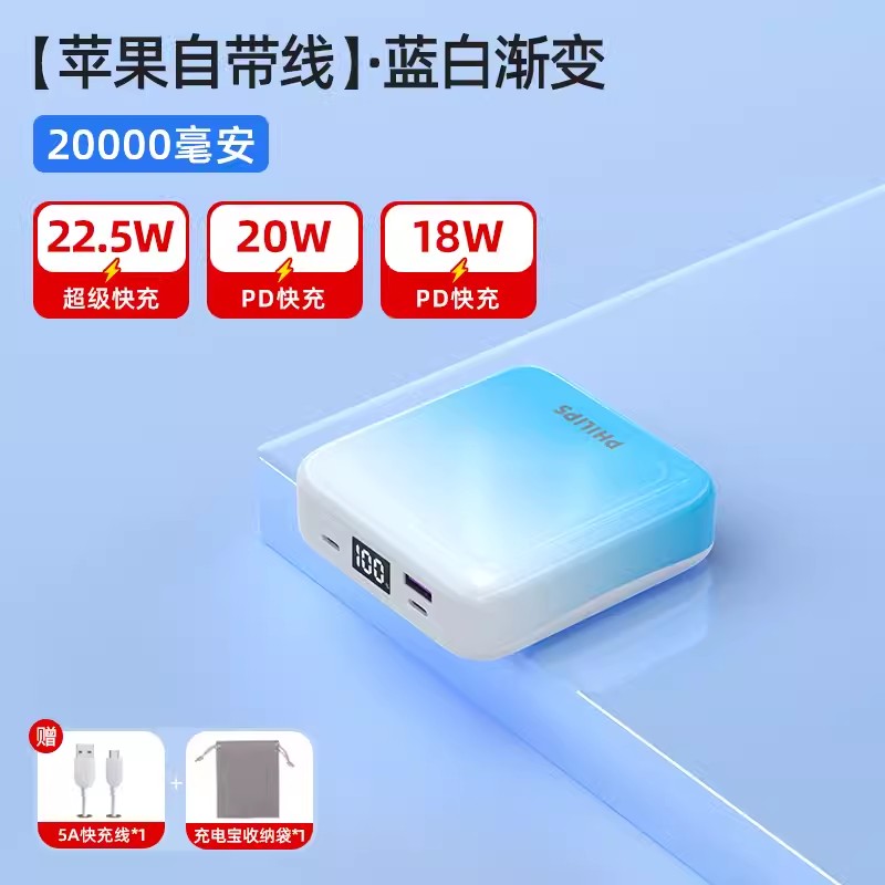 飞利浦充电宝20000毫安3C认证自带线大容量移动电源正品可上飞机快充输出超薄便携迷你新款适用苹果华为小米