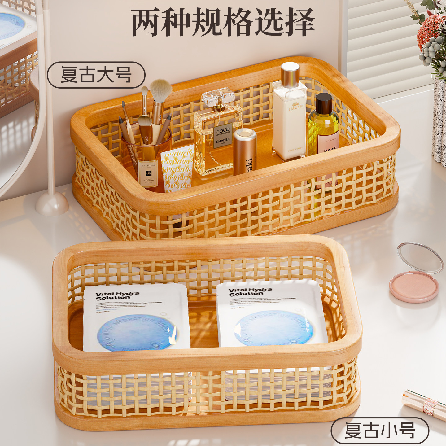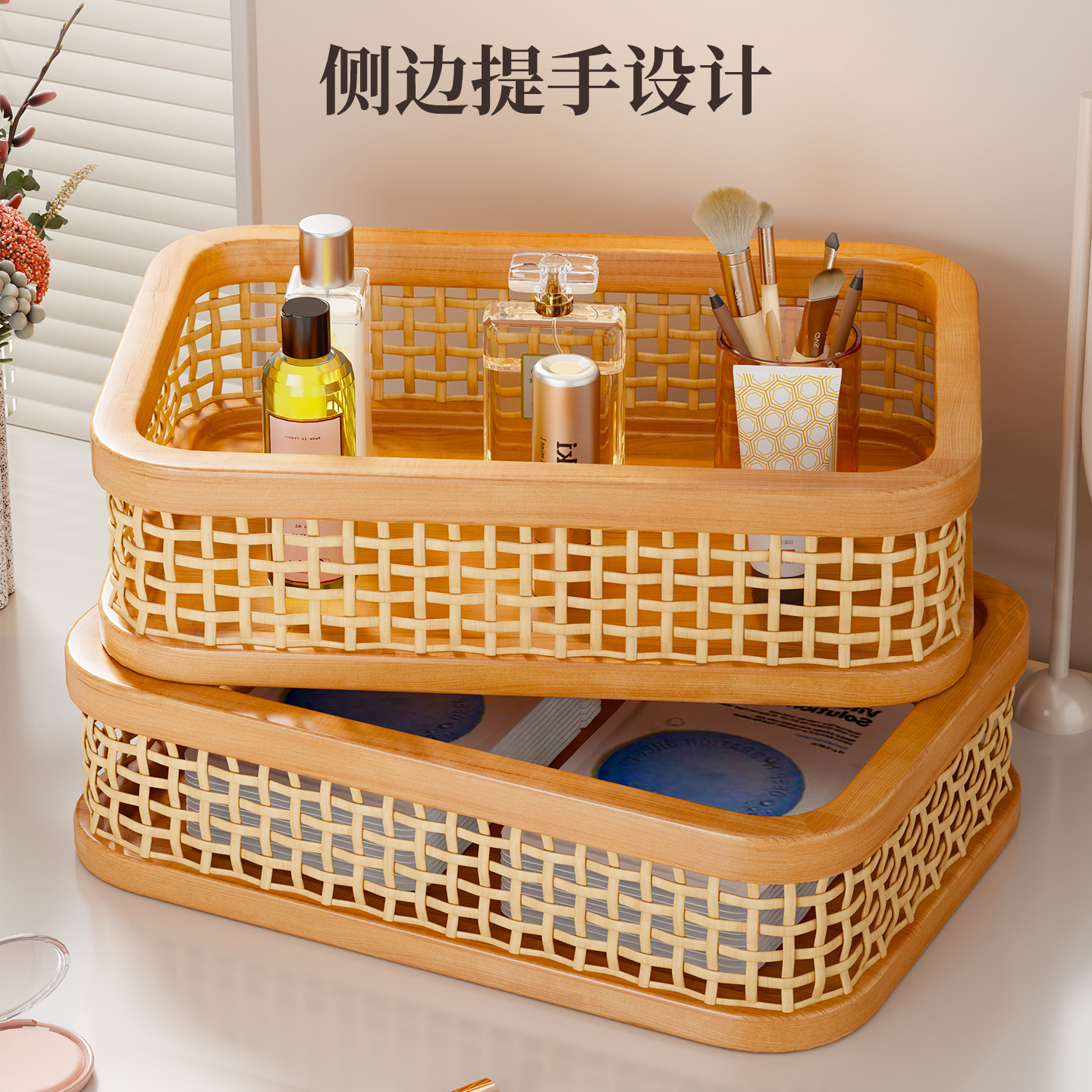实木化妆品收纳盒梳妆台大容量护肤品放置盒桌面侧面带提手整理盒
