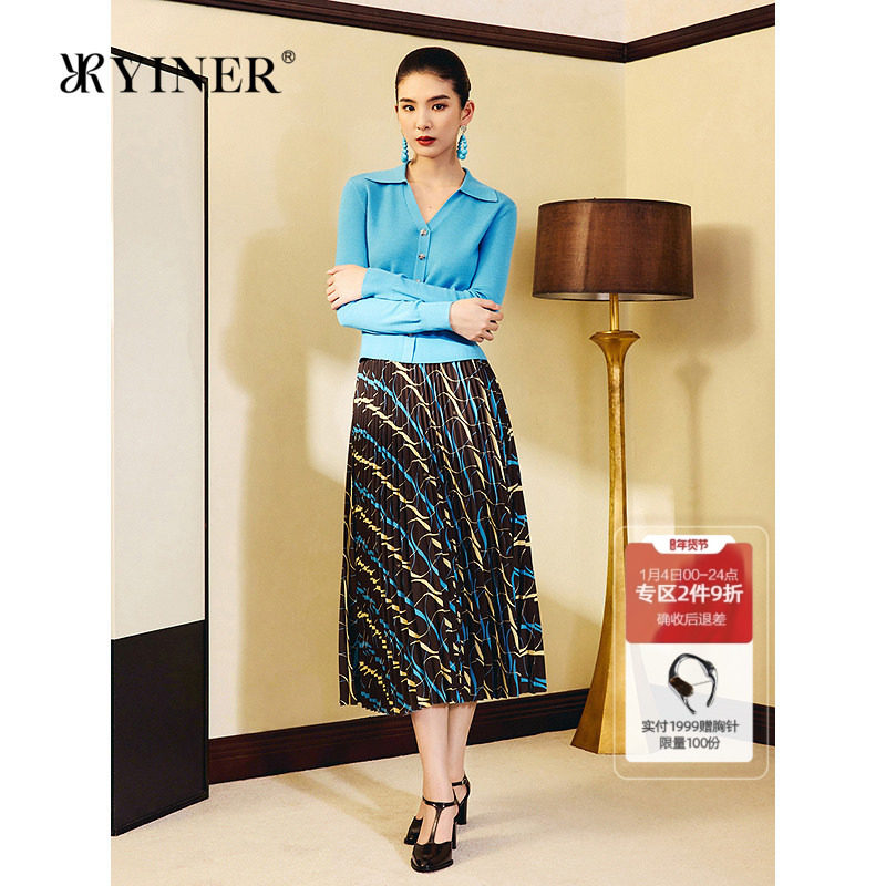 【1996系列】YINER音儿2025秋季新款雪纺中长艺术印花百褶半身裙