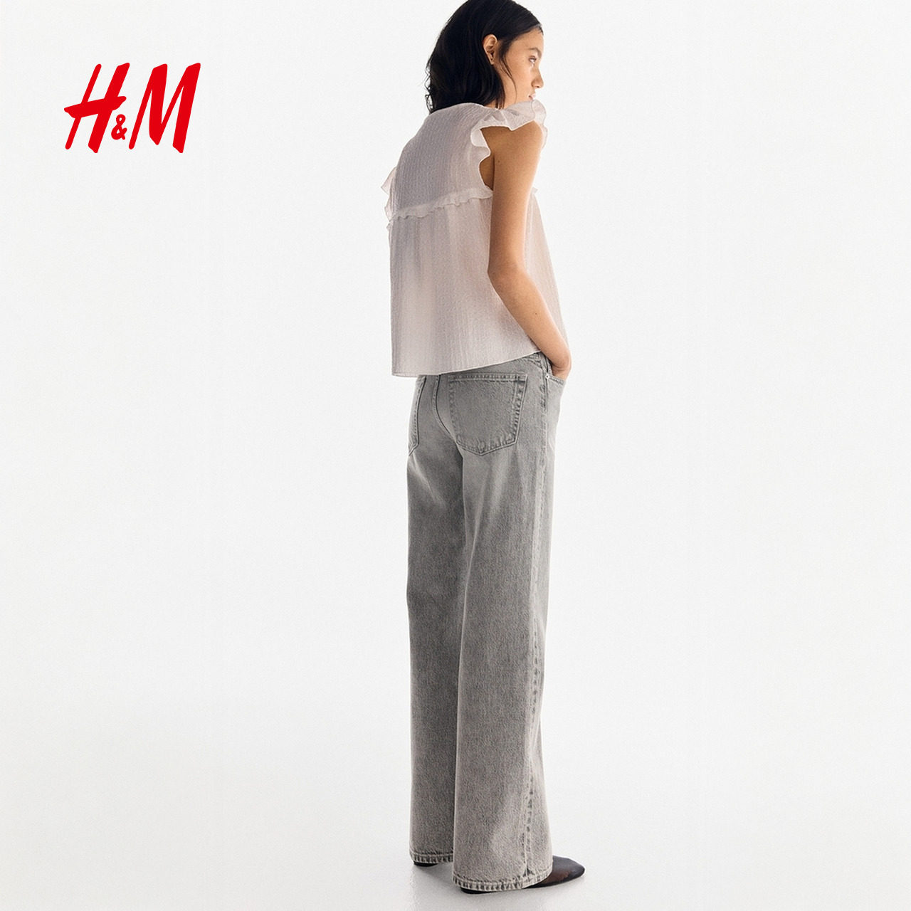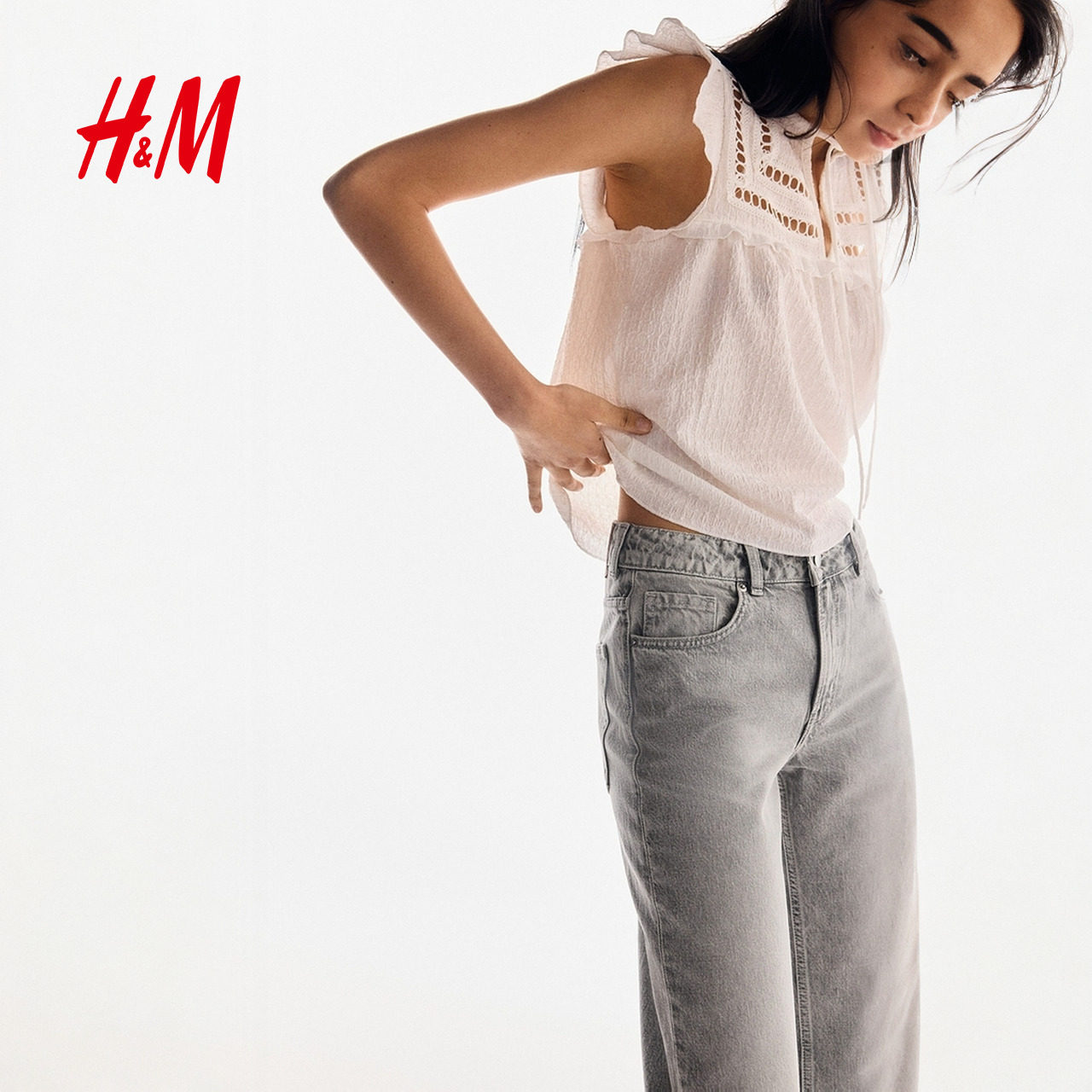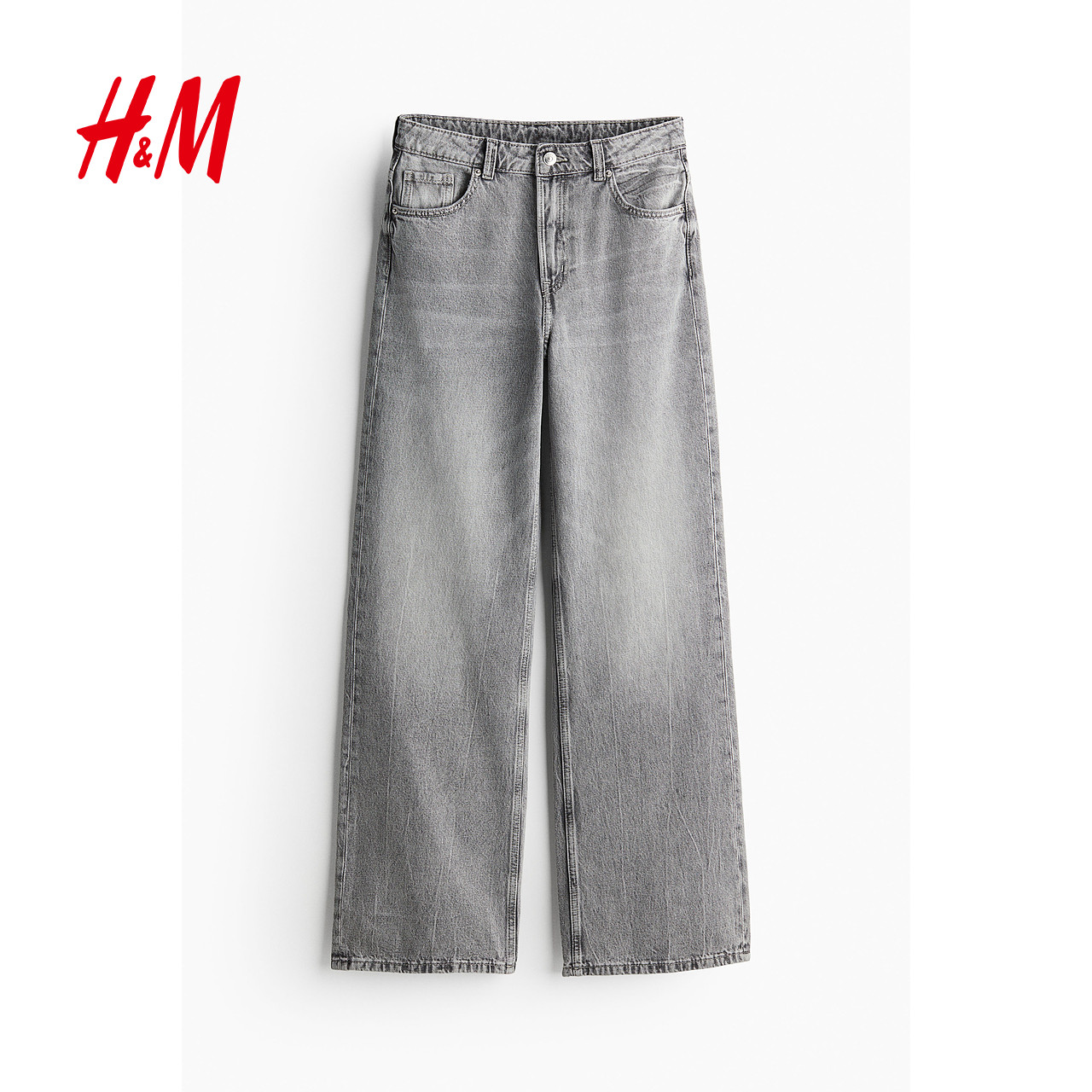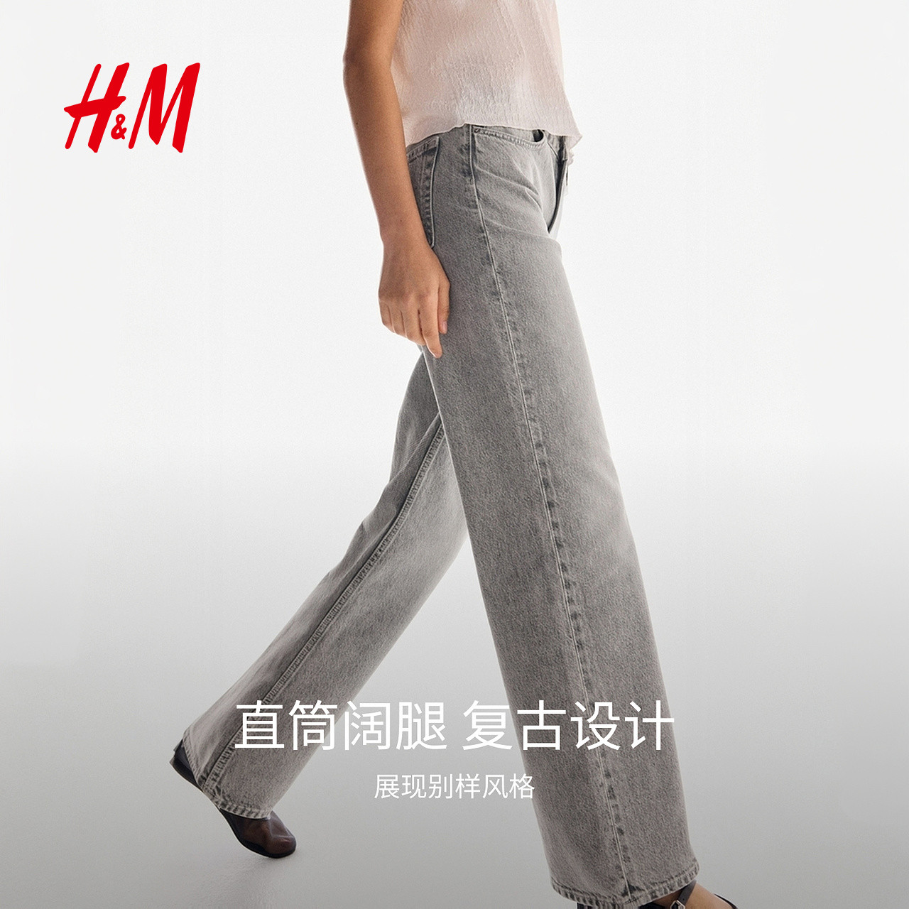 HM女装透气5袋式棉质直筒高腰阔腿牛仔裤休闲长裤0871889
