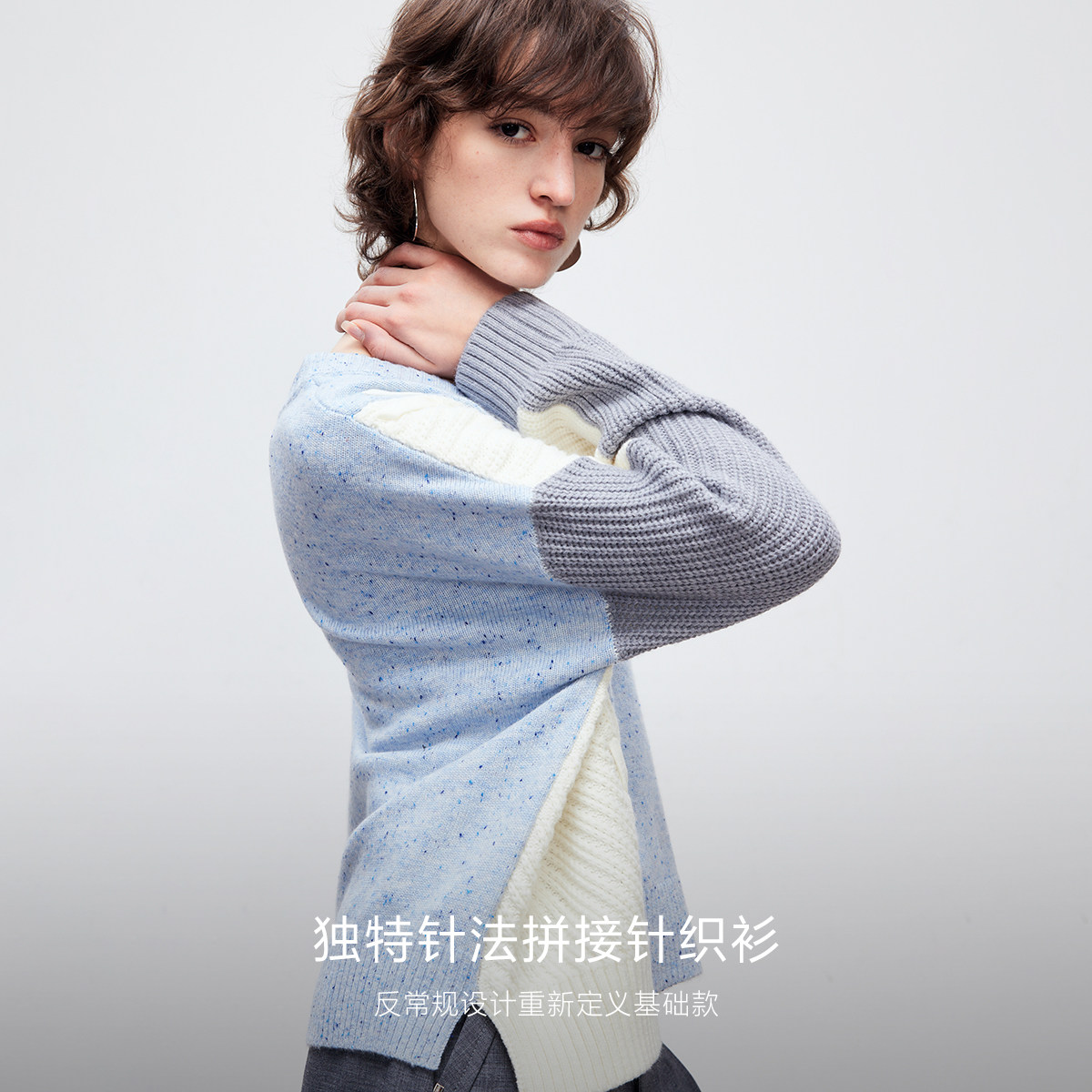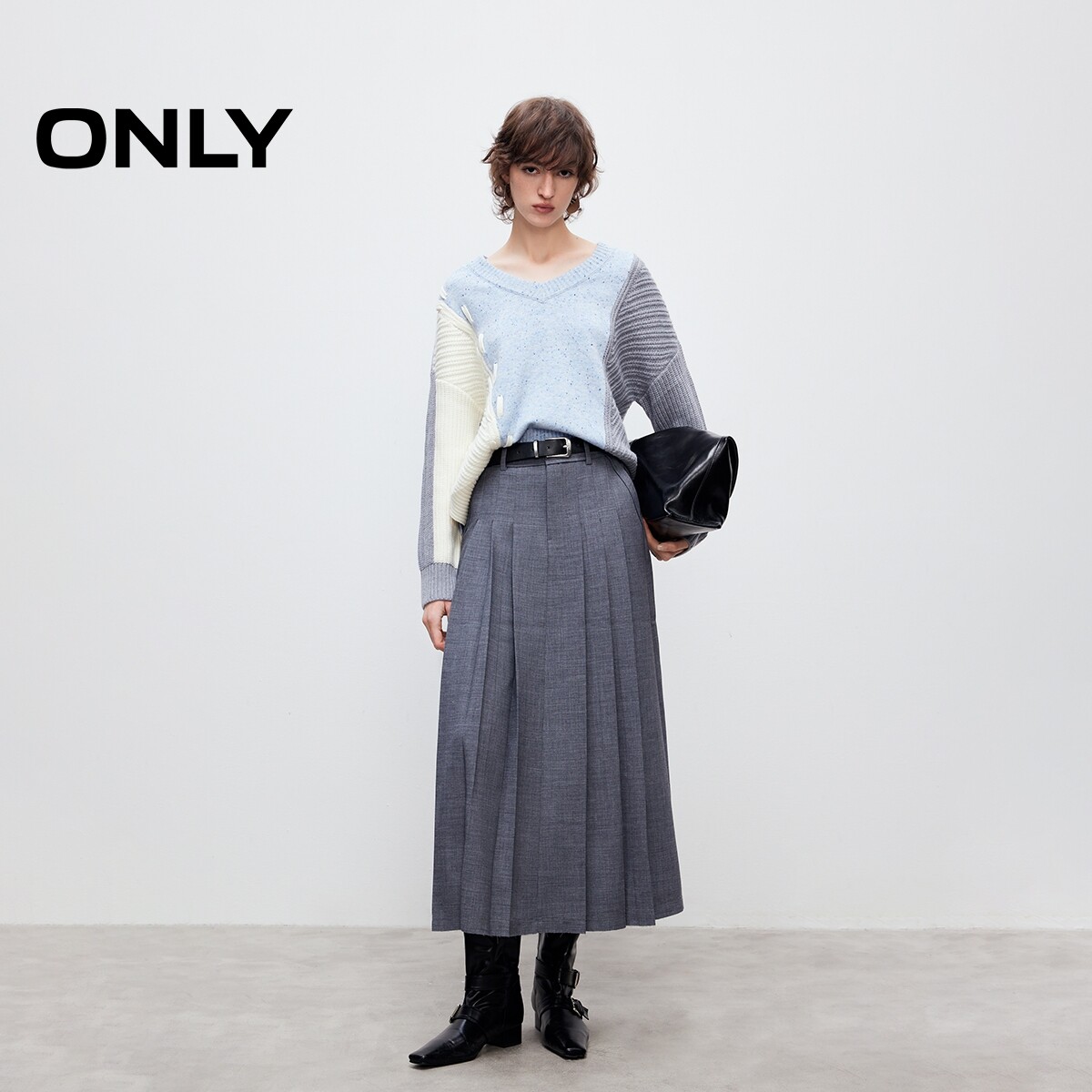 【ONLY奥莱】春季宽松落肩V领撞色独特多针法拼接毛衣针织衫女