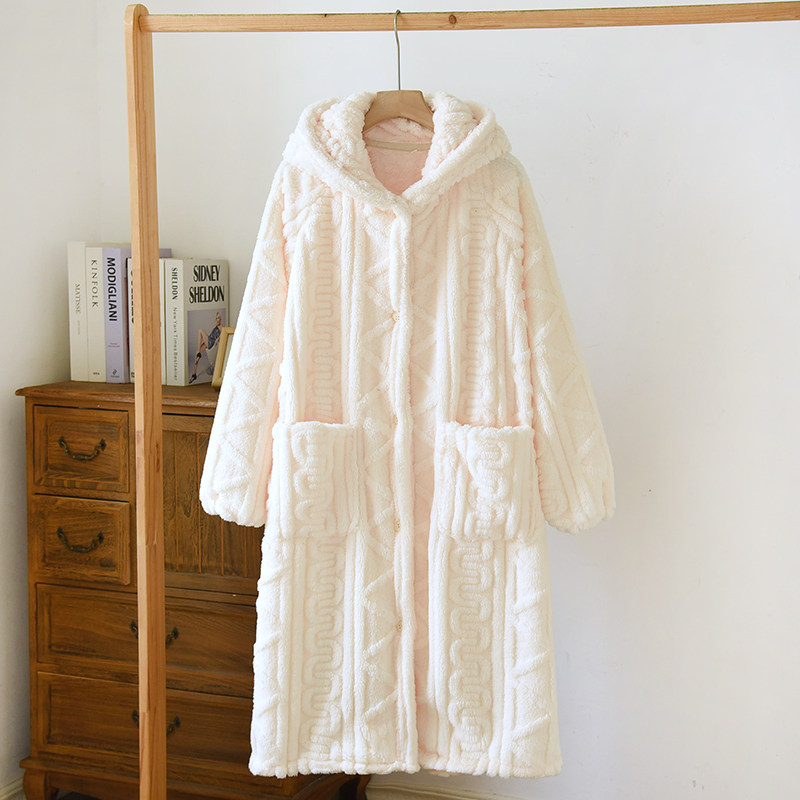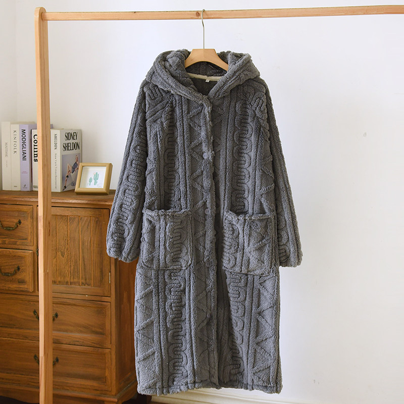 加绒加厚情侣睡袍秋冬款法兰绒保暖珊瑚绒纯色麻花连帽家居服浴袍
