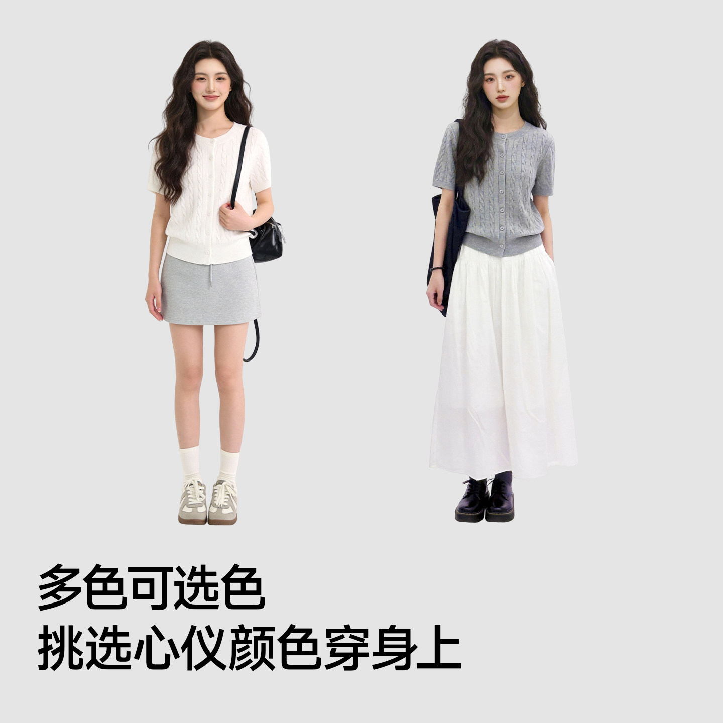 猫人白色超透气圆领绞花短袖开衫女2026夏季新款高级减龄上衣服Z