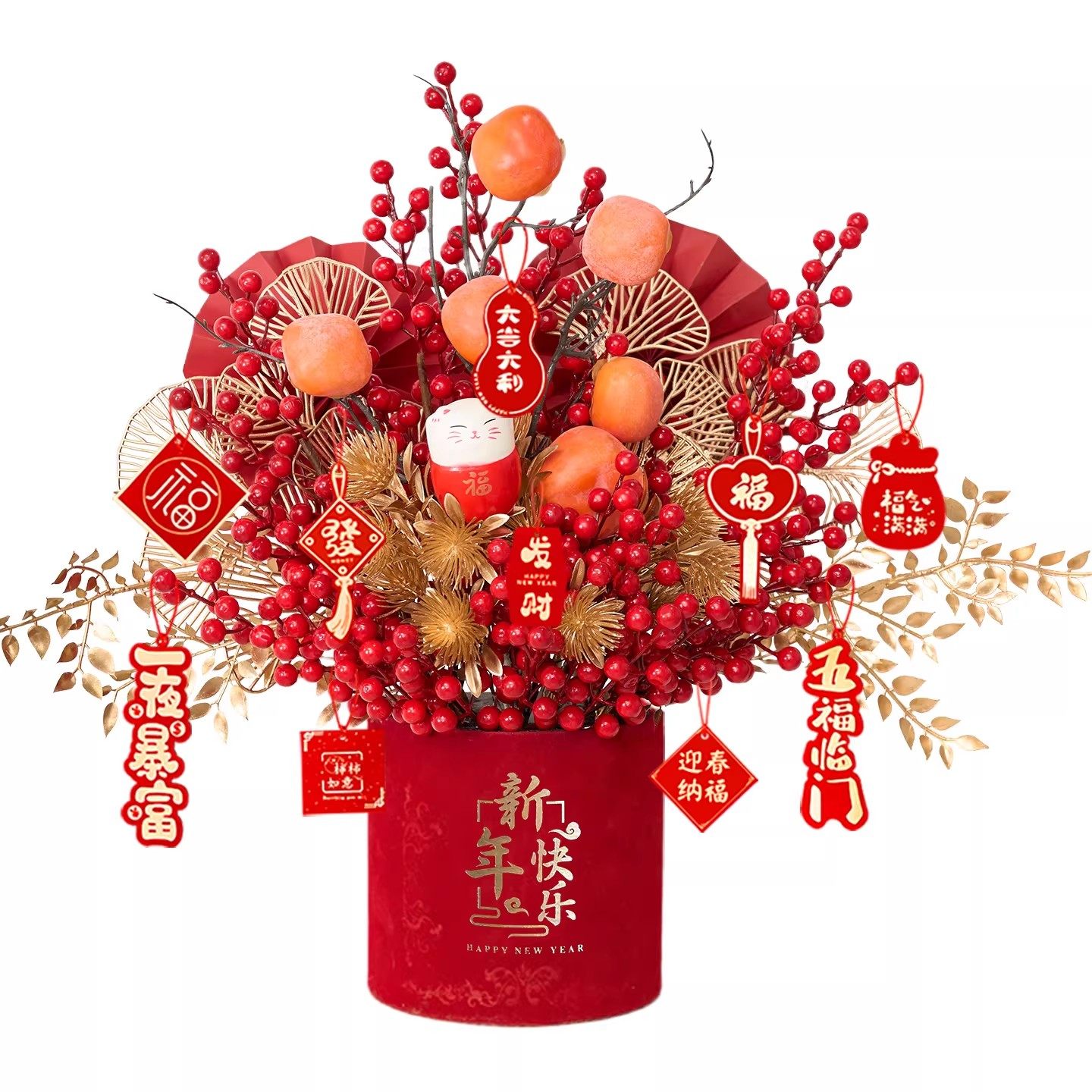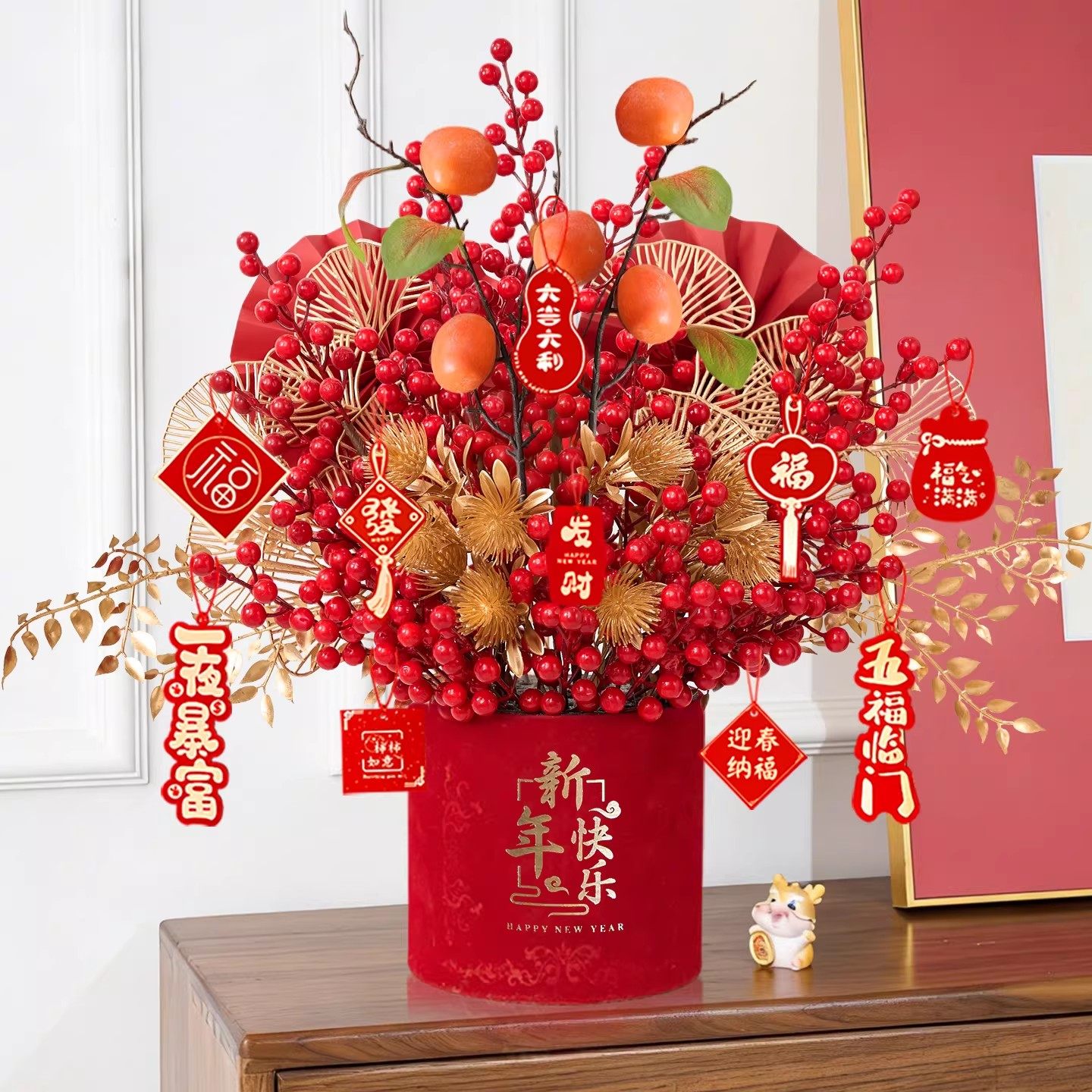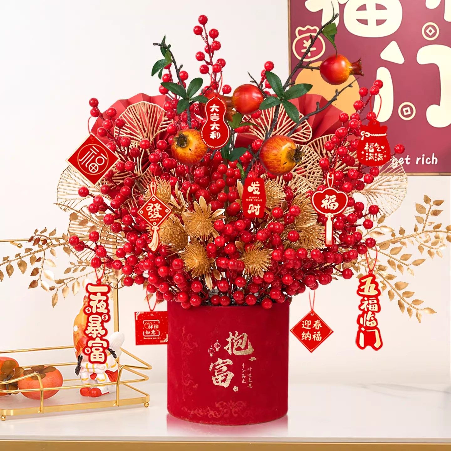 2026年宵花新年摆件发财果装饰仿真花过年福桶插花红果春节抱抱桶