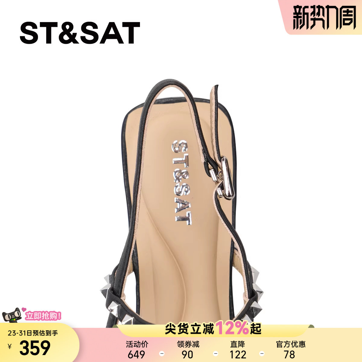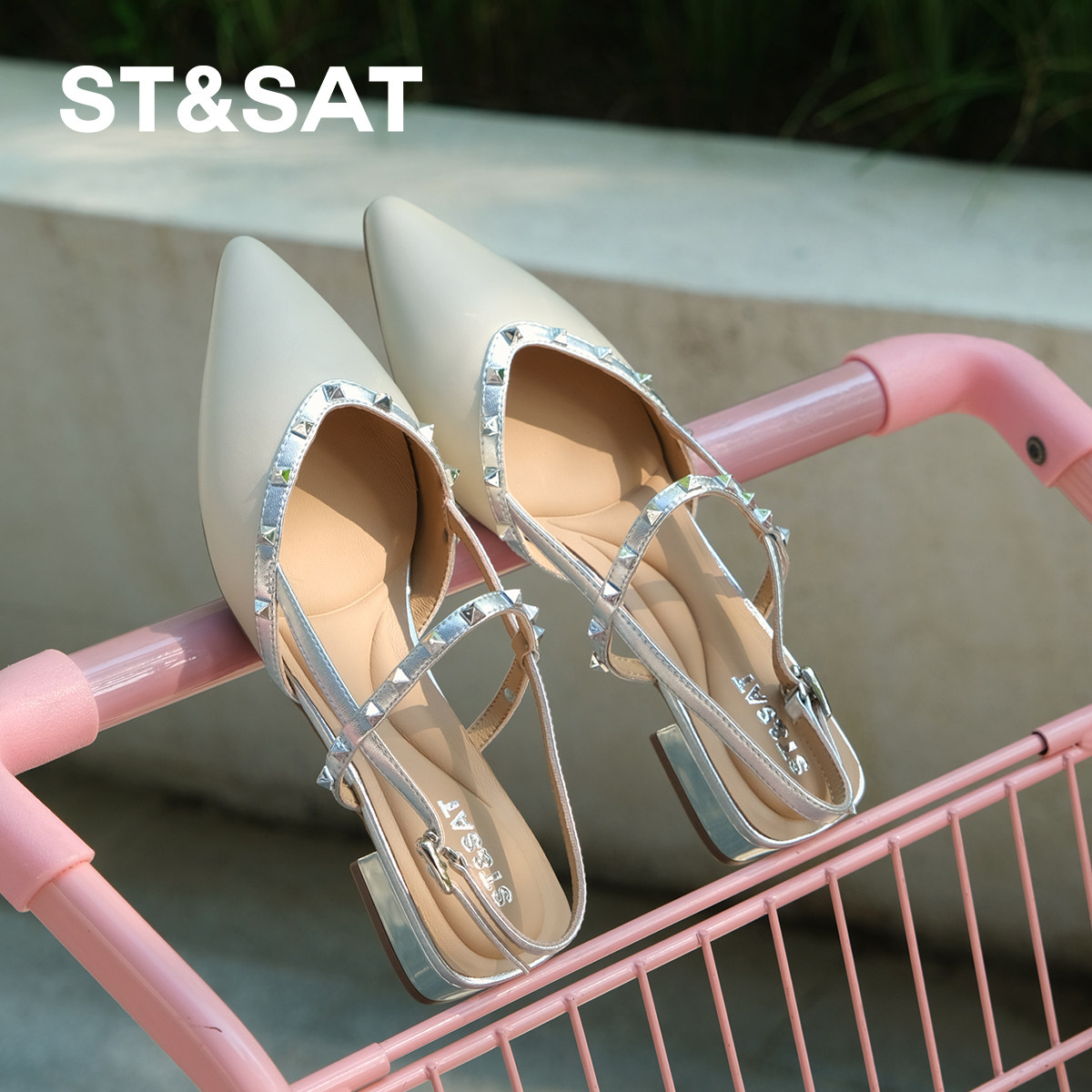 星期六高级感羊皮夏季气质包头凉鞋女尖头气质铆钉配裙子一字带鞋