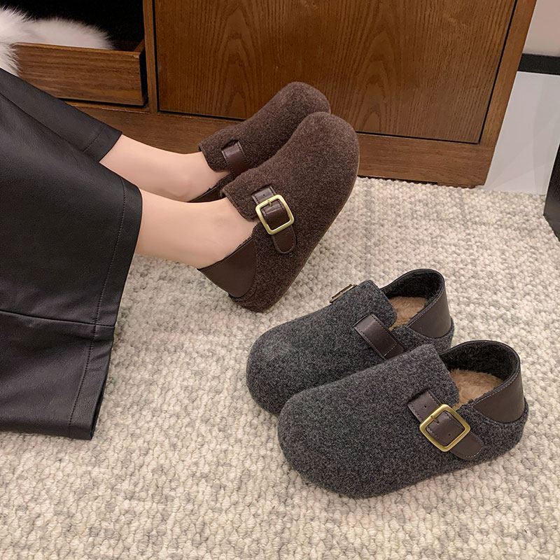 厚底内增高两穿勃肯鞋女2025新款秋冬毛呢懒人加绒棉鞋单鞋圆头