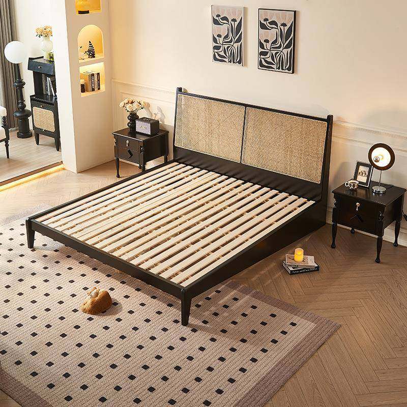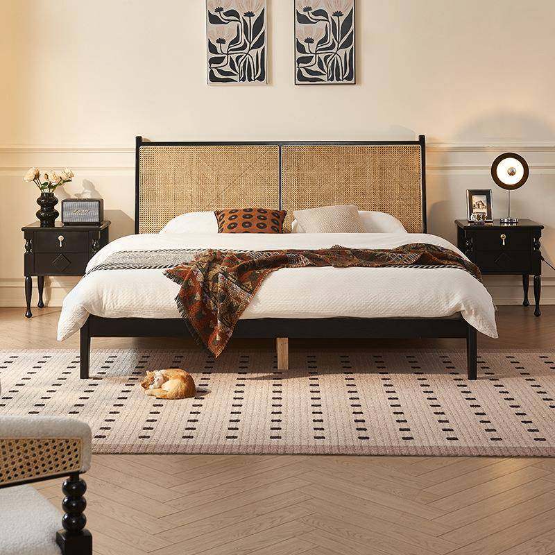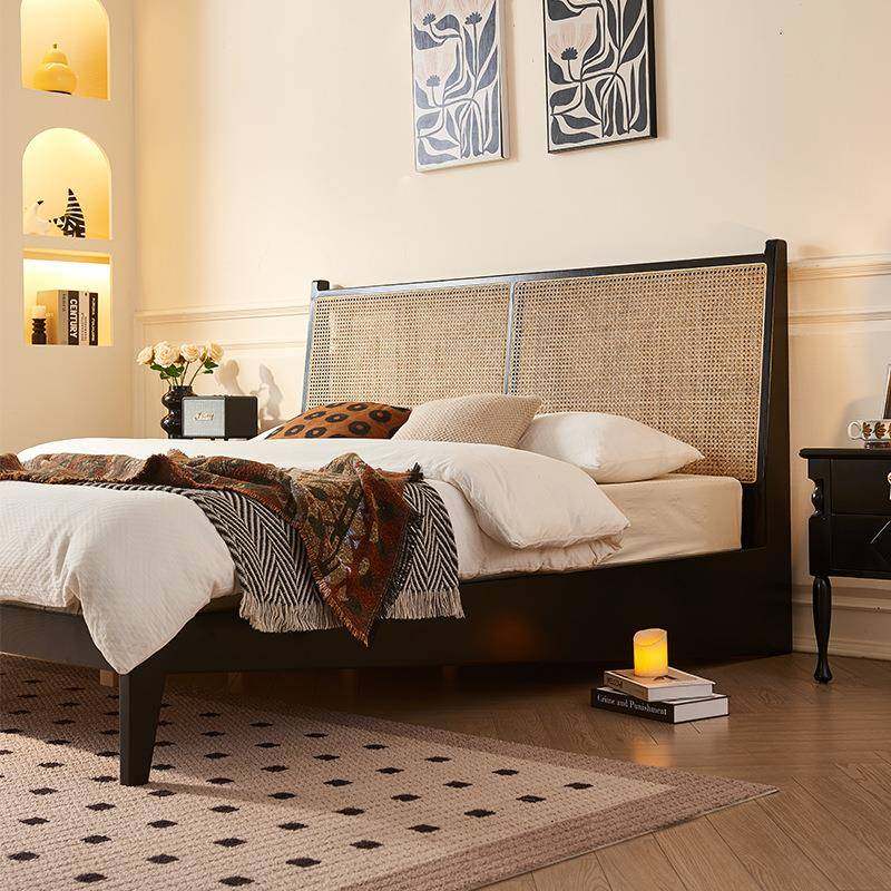 现代简约藤编实木床黑色卧室1.8m双人床设计师1.5m单人酒店民宿床
