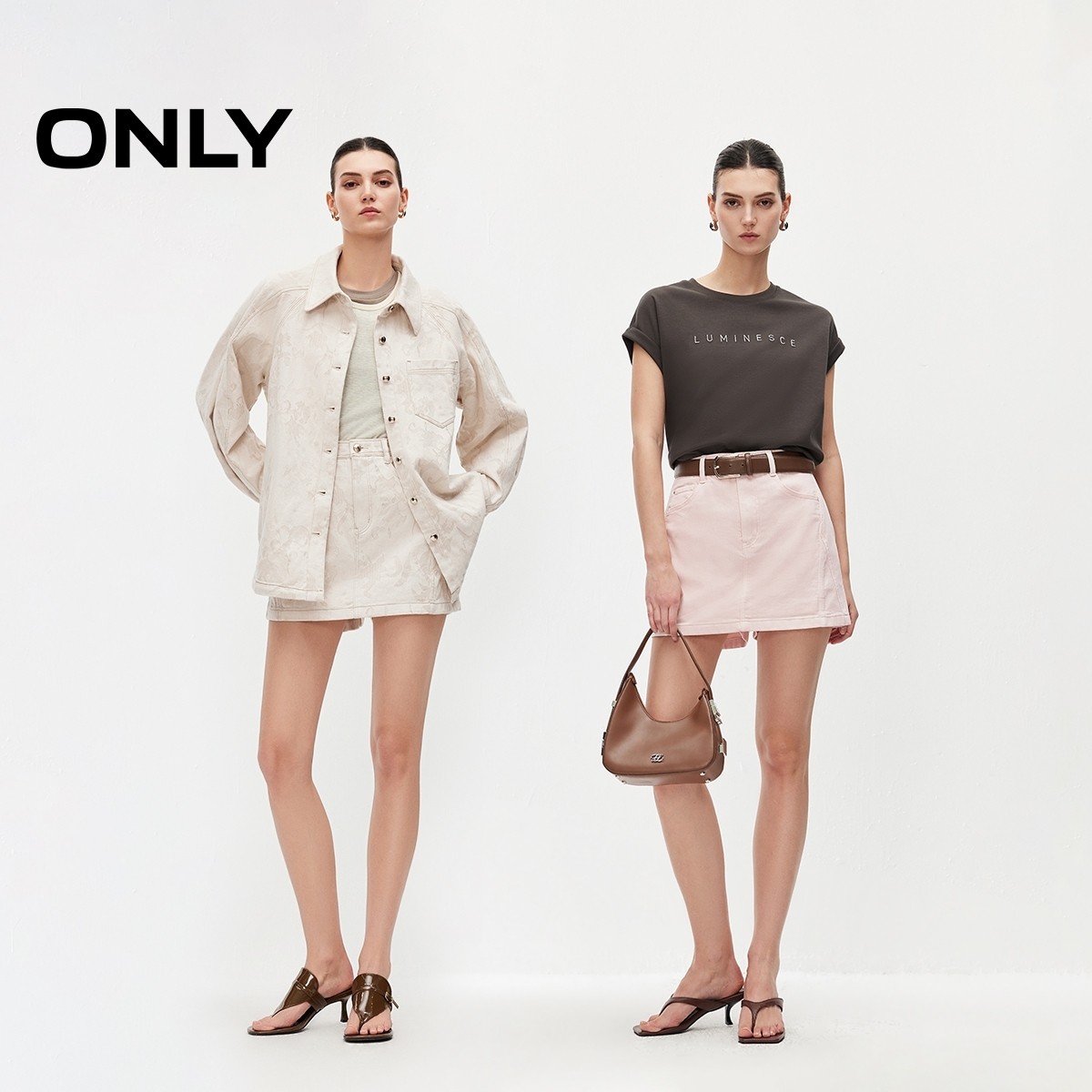 ONLY2026春季新款甜美暗纹立体印花高腰裤子粉色A字牛仔裙短裤