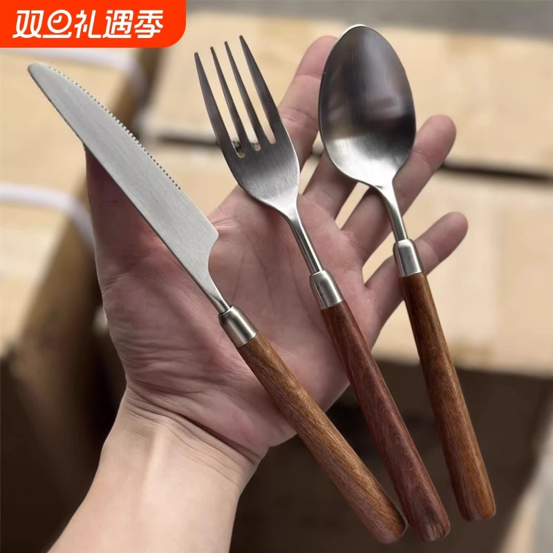 胡桃木柄简约质感不锈钢勺子叉子套装家用西餐餐勺高颜值餐具