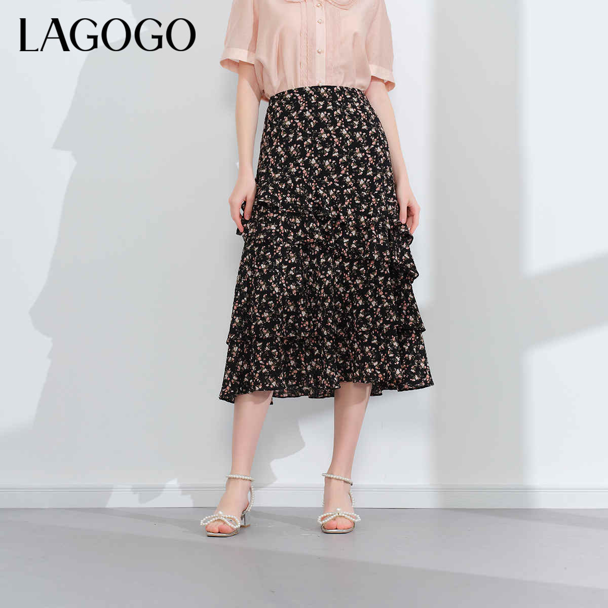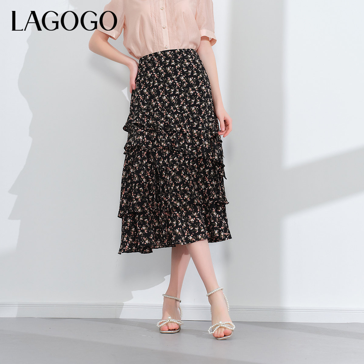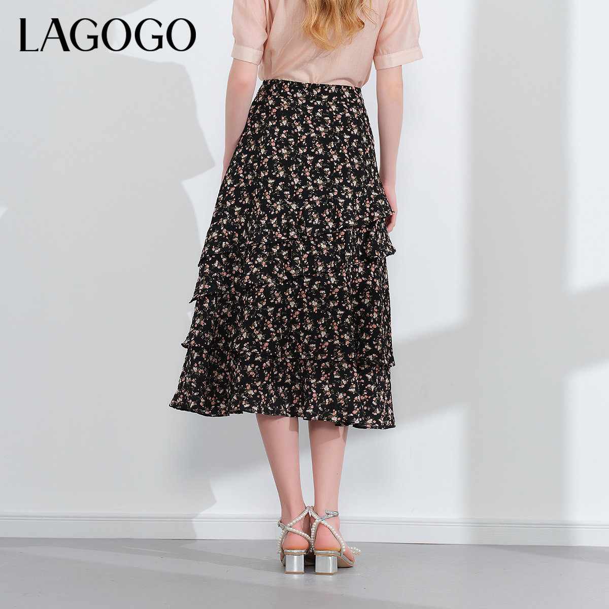 LAGOGO雪纺荷叶边碎花半身裙女拉谷谷夏季新款小个子不规则蛋糕裙