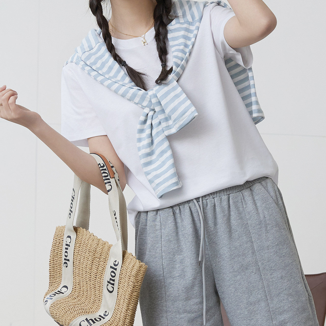 白色正肩短袖T恤女夏季春秋基础款内搭棉质打底衫体恤宽松上衣
