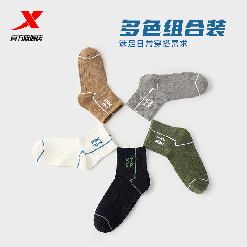 特步五双装中筒袜正品男子组合装舒适透气运动袜女士四季袜子