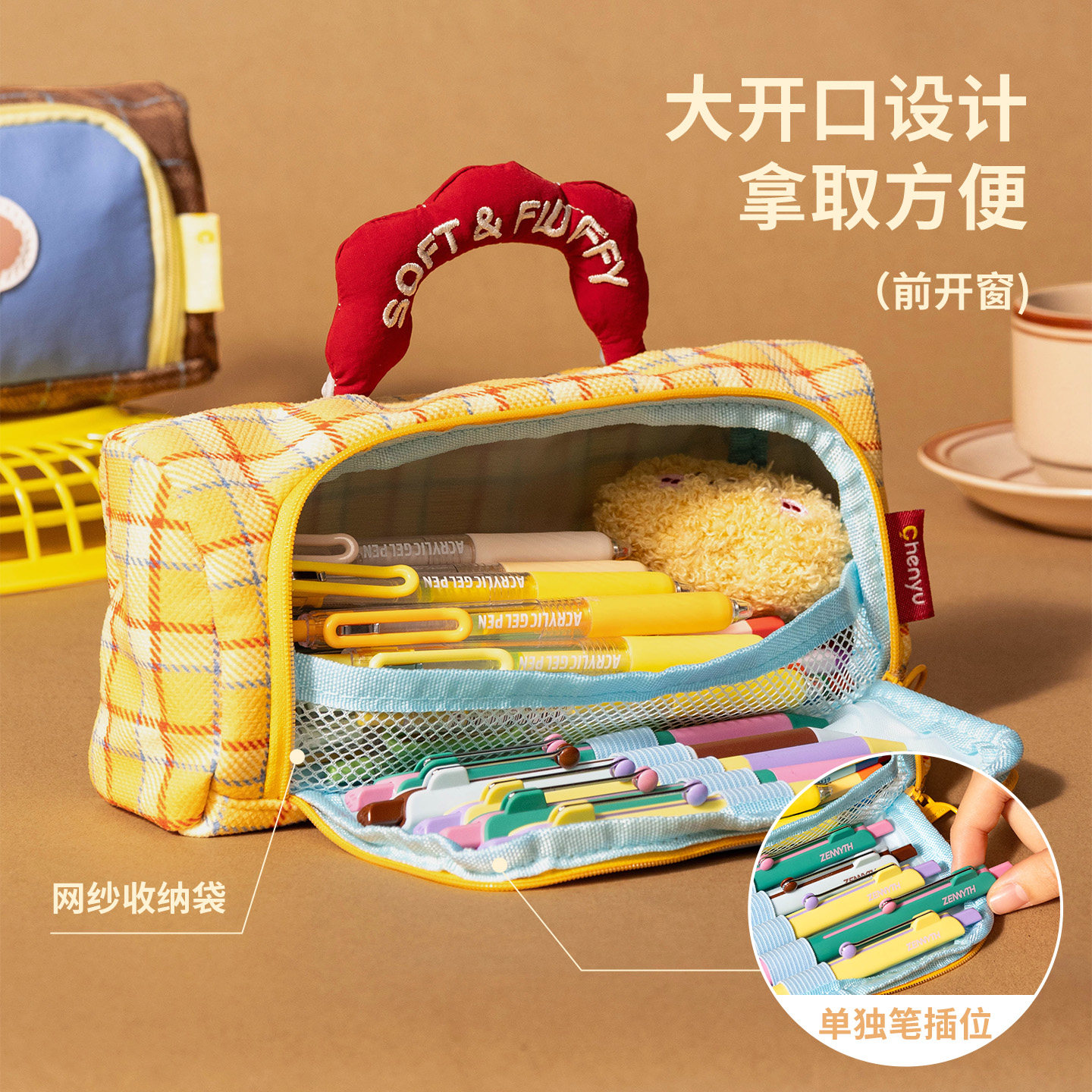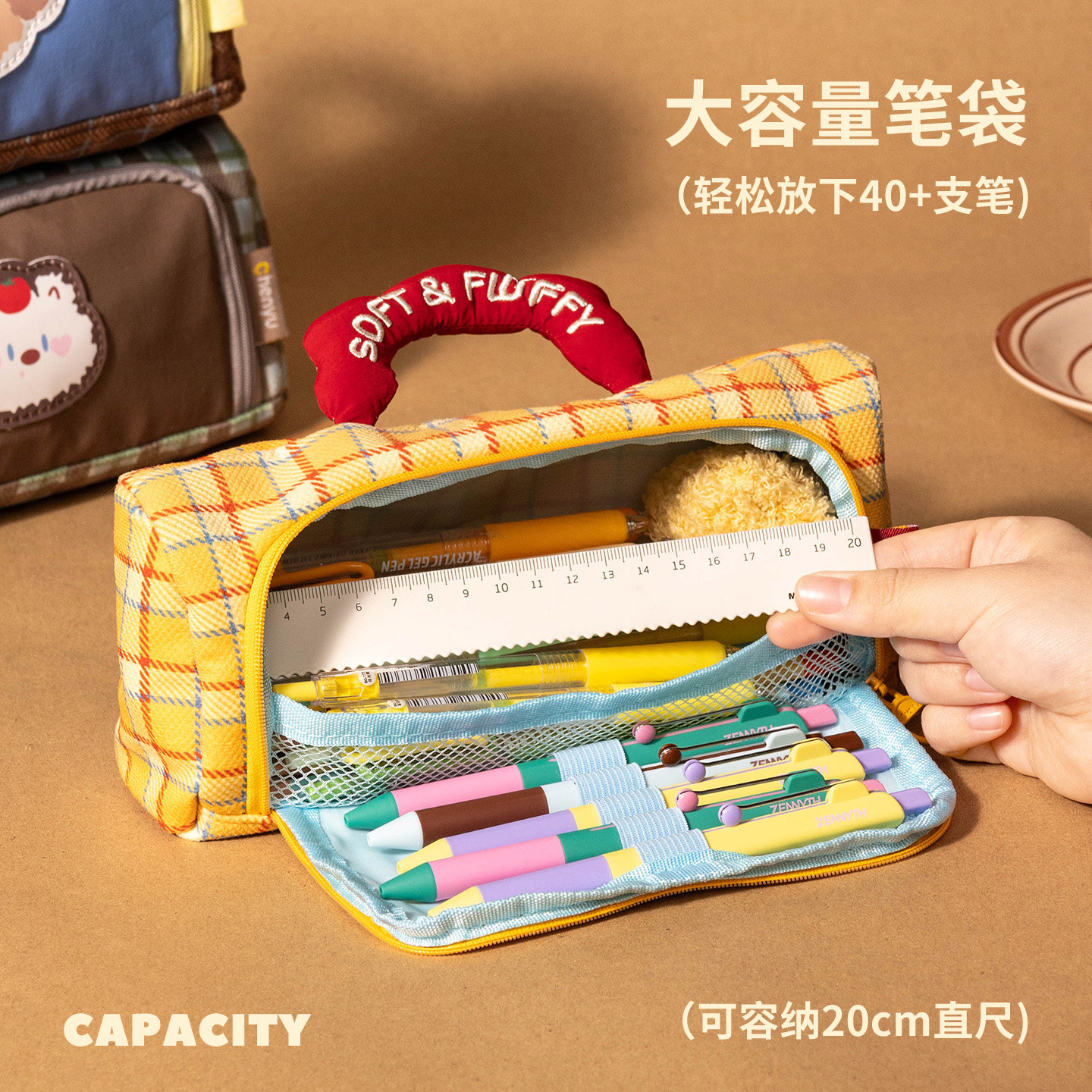 三年二班 格纹提手笔袋女生2025新款文具盒男孩款大容量小学生笔盒高颜值ins风铅笔盒学生用初中生文具袋