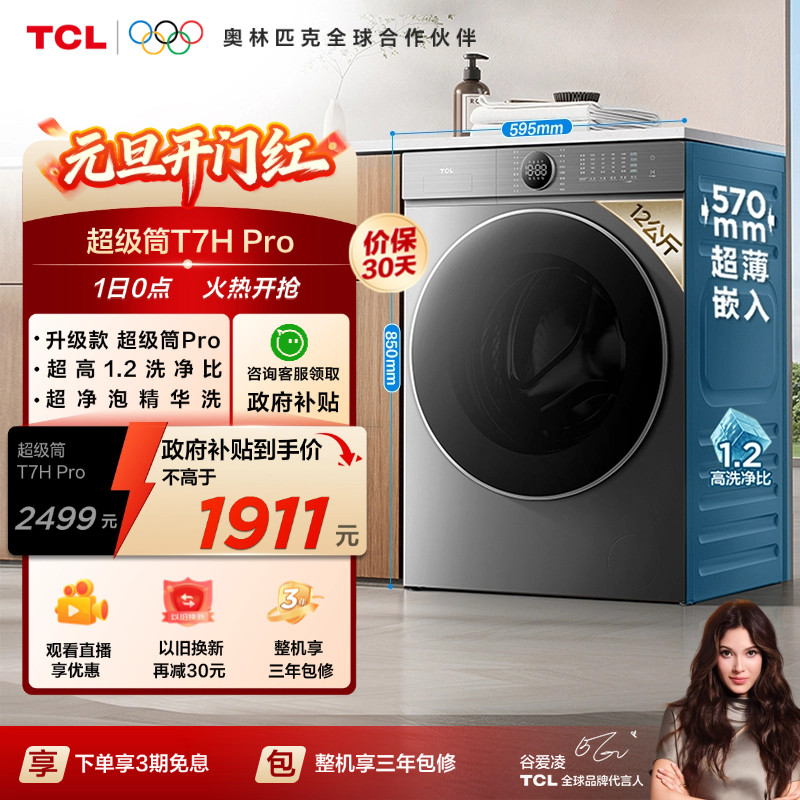 TCL 12KG超级筒T7HPro大容量滚筒洗衣机1.2洗净比全自动洗衣机